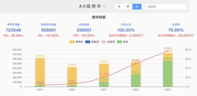 再从另外一个角度观察A0级轿车市场:2019年至2023年,该细分市场的整体销量规模先从62.2万辆萎缩至42.4万辆的谷底,而后又飞升到72.3万辆的历史新高。