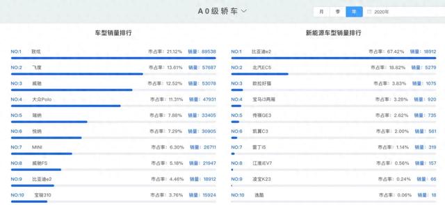 在比亚迪海豚尚未问世的2020年,中国A0级轿车市场是如下局面: