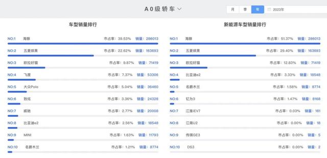 到了海豚上市(2021年8月底)后的2022和2023年,A0级轿车市场的销量榜单已是天翻地覆:致炫、飞度、威驰、Polo等燃油车型节节败退,而比亚迪海豚、五菱缤果、欧拉好猫等纯电车型则飞速攀升。2023年,该细分市场销量TOP3已被这三款电动车占据,CR3达到72%。