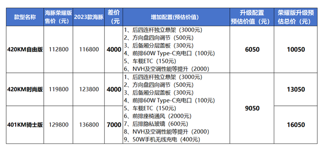 此外,如上文所述,电动车替换燃油车的时代背景下,舒适性配置正在成为A0级轿车市场重要的竞争点。而海豚荣耀版(相比前序版本)的配置升级,正是将舒适性配置作为主要着力点。根据配置表,我们大致推测了海豚荣耀版升级配置所带来的价值提升,如下图: