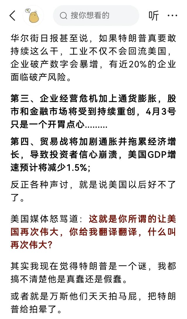 坏土豆也看不懂他的迷之操作,不知道他到底要给美国带到什么地方,他的做法表面上能多收点税,实际是在透支美国的信用和未来,面对这样不择手段的国家,一旦全世界有摆脱他的方法,谁还会带他玩。