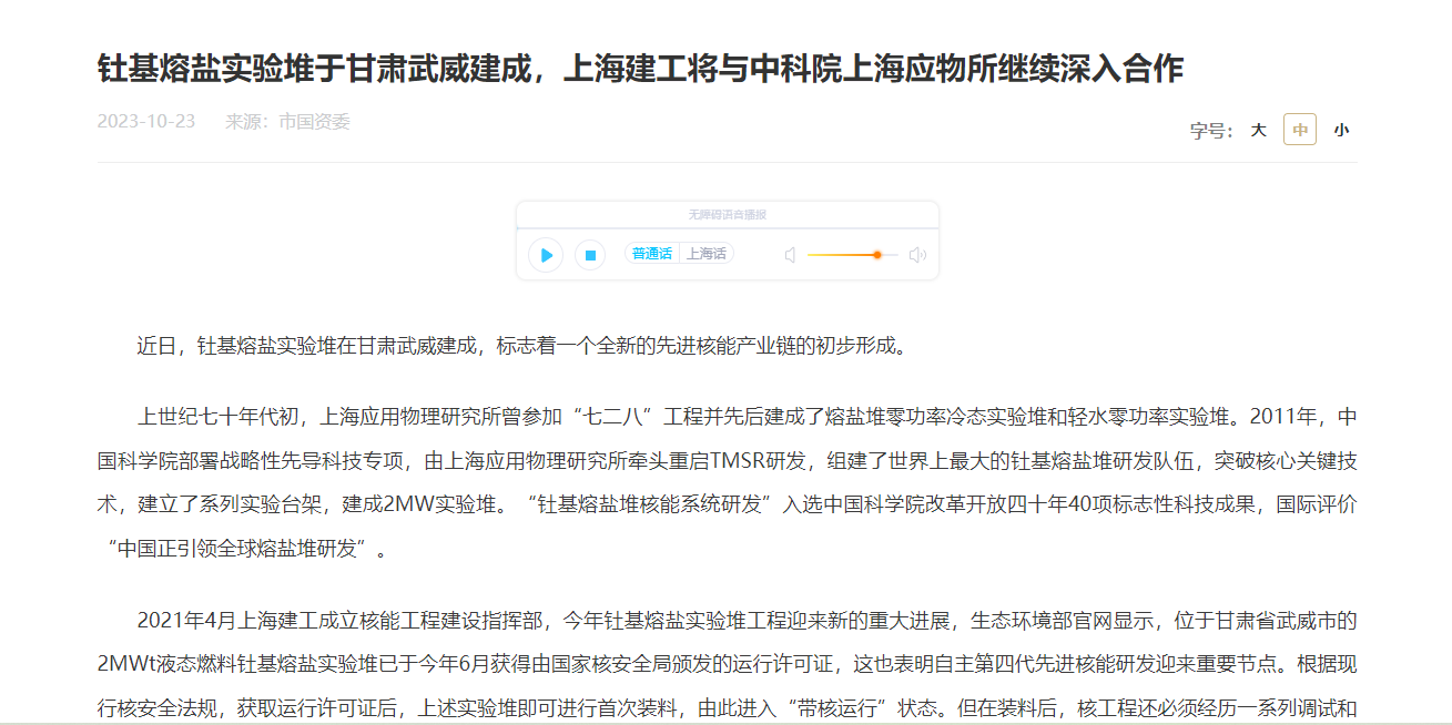 2、市国资委:《钍基熔盐实验堆于甘肃武威建成,上海建工将与中科院上海应物所继续深入合作》