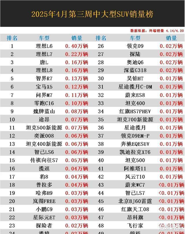 2025年4月第三周(4.14/4.20)中大型SUV销量榜单,新能源车型霸榜前五,燃油车老将普拉多只能排到第18,这仅仅是消费者用脚投票的结果吗?