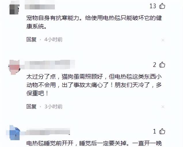 也有网友表示:“宠物自身本来就有抗寒能力,给他们使用电热毯只能破坏它的健康系统。我感觉这样的做法太过分了点,猫狗虽然需要照顾好,但电热毯这类东西小动物不会用,出了事故太痛心了,朋友们天冷了,大家还是要多注意的,消防战士真的很不容易的!”