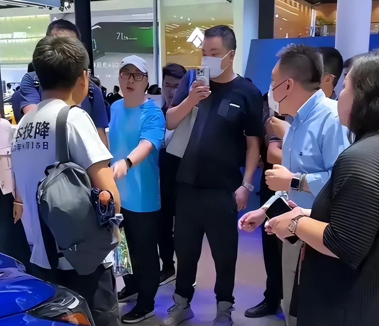 就在博主和工作人员进行激烈讨论的同时,一直站在人群当中的“蓝衣大佐”突然当众指责这位汽车博主,并认为他身上的衣服太极端了。