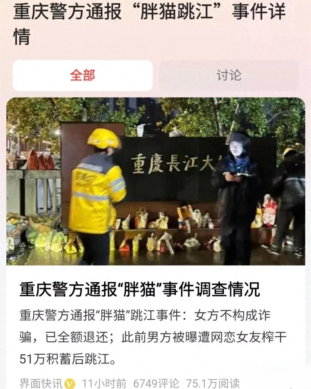 21岁男孩与女友分手后,绝望之下跳江。他不远千里搬到女友家附近结束异地,没日没夜当游戏陪玩,挣钱帮女友开花店,而自己缩在一间小出租屋里,吃十块钱不到的外卖。跳江12天才被捞出来,网友为其声讨20天,如今迎来逆天翻转。 (信源:重庆警方通报“胖猫”事件调查情况:谭某不构成诈骗犯罪——央广网) 五一原本是个欢乐的日子,可热搜上的“胖猫”却给人增添了一抹沉重。或许是因为大家都闲在家,这件事不仅收获了大量网友的关注,还迅速冲上热搜。 本该是阳光开朗大男孩,“胖猫”却被爱情所困,一门心思搞钱给女友花。可是在不断的付出下,他迎来的却是和女友的一次次争吵。 或许是一时没看开,在一次争吵后,“胖猫”决定跟女友分手,还将自己随后剩下的几万块钱转给了她,标明了自愿赠与,随后来到江边一跃而下。 因为过于伤心,“胖猫”的姐姐刘女士将弟弟和女友小谭的聊天记录上传到了网络上,一时间掀起了惊涛骇浪。 在刘女士的截图中,胖猫和小谭的恋爱付出极其不对等。自从“胖猫”在网上认识了同样喜欢玩游戏的小谭后,便像着了魔一样,一发不可收拾。 为了能守护自己的爱情,胖猫更加努力的挣钱,又是去找女友玩耍,又是给她钱,送她礼物,可是小谭却并不知足。在一次争吵后,两人分手,不过没多久就旧情复燃了。 但这次和好,小谭提出了一个要求,那就是希望胖猫能来重庆结束异地。 虽然人生地不熟,但胖猫还是一口答应了女友的要求。可当他开心的跑到重庆后才发现,小谭是跟父母一起住的,而自己只能在附近租房子生活。 尽管如此,胖猫还是甘之如饴。恋爱的两年时间里,他多次给女友转账,金额高达79万,尤其是在小谭提出想开花店后,学历不高的胖猫只能更辛苦的熬夜打游戏挣钱,可透支了身体的同时,跟女友之间还有无数矛盾。 其中原因,不乏胖猫工作忙,没时间搭理小谭,以及其他原因。在一次次的争吵中,小谭表示需要一段冷静期,两人各过各的生活。 只是,她好像忘了,胖猫根本就没有自己的生活,他的日常就是陪玩工作。而在这个人生地不熟的地方,除了小谭,甚至没有亲朋好友能开解一下他。 几天后,胖猫将自己仅剩的钱全给了小谭,随后跳江。 纯爱战神倒地的同时,网友们站起来了。在刘女士的引导下,网友们十分同情胖猫的遭遇,甚至用“捞女”来形容小谭。 为了表达对胖猫的惋惜,大家自发点了不少鲜花、奶茶、汉堡送到胖猫跳江的地方,只为让这个生命得到安息。也由此,展开了一场闹剧。 众多店家不约而同发了空包过去,引发网友声讨,开始疯狂道歉,随即小谭的信息也被人肉出来,花店门口堵满了人。 与此同时,还有颇具影响力的明星、网红加入到声讨大军之中,有人为了流量不惜假冒刘女士身份发布不实言论,还有人散步谣言说胖猫其实没跳江。 诸如此类的乱象层出不穷,一直到5月19日,官方的通告扭转了这一切。 在警方的调查中,虽然胖猫在这场恋爱中付出许多,但小谭同样也是。她也曾带着胖猫见了家长,曾劝说胖猫不要天天打游戏挣钱,也会给胖猫转钱。 从两人的聊天中,可以看出他们其实是正常的恋爱关系。至于网友们的误解,很大程度上归功于胖猫姐姐的刻意引导。 今天,胖猫姐姐的社交账号已经被封,而协商后小谭也退还了与胖猫恋爱期间的消费差额。 事情看似有了结果,但实则不然,毕竟胖猫事件的后续影响依然存在。只能说,大家要理性吃瓜啊。