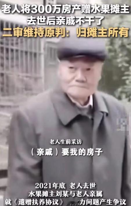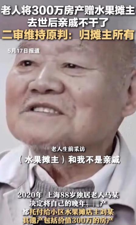 “如意算盘落空了!”上海独居老人去世,留下价值300万的房产,妹妹满心欢喜来继承,却被告知:房子已被老人送给一水果摊主了。老人妹妹不服,起诉水果摊主坑骗老人,二审结果大快人心。 (信源:上海老人300万房产赠水果摊主案二审宣判:维持原判——央视网) 随着年龄的增长,老人已经88岁了。早在6年前,老人送走了陪伴自己一生的妻子,虽然备受打击,他却很清楚自己不能一昧地沉浸到悲伤之中,只因他还有个患有精神疾病的儿子需要照顾。 人固有一死,可白发人送黑发人依然是种悲哀。2017年,老人唯一的儿子也去世了,这固然减轻了老人的生活压力,可也让他陷入了孤独之中。而到了这个时候,唯一能让他感到欣慰的,就是认识了水果摊主小刘。 他们是最熟悉的陌生人,也是相伴多年的邻居。小刘在这里卖水果多年,早就已经跟老人十分熟悉,在一次次的闲聊中,他深知老人家里的情况,因此时常给予一些帮助,而这一帮就是好几年。 老人儿子去世,亲戚朋友没有人来帮忙,而后几个月,老人肉眼可见的衰老了很多。小刘将这一切看在眼里,更加关注老人的情况。 那天,小刘察觉到老人没有像往常一样出现,心中瞬间涌起不安,连忙就赶到了老人家中,果不其然看到老人摔倒在地不省人事。 小刘赶紧将人送往医院,此后在老人的住院时光里,小刘除了上午进货的时间以外,都在老人的病床前照顾,一直将老人照顾到出院,也没见有亲戚朋友前来探望。 而小刘的善良也深深地感动了老人,在他的眼中,这早已不是普通的水果摊主,而是能给自己养老送终的“儿子”。 为了报答小刘的照顾,也为让自己能够安享晚年,他做出了一个决定,那就是让小刘一家人来自己家一同生活,小刘一家负责照顾自己,而自己的所有财产也都会交给小刘。 就这样,在2017年,双方签订了《遗赠抚养协议》,两年后正式做了公证。 这一新闻无疑是令人震惊的,这水果摊主要么是有点手段的,要么就是真的对老人好,不过更令人好奇的是,从始至终,老人的亲人一直没有站出来有所表示。直到2020年底,事情出现了反转。 老人的妹妹通过新闻得知这件事,讲述了另一个版本的故事。 原来,2017年老人儿子去世,亲人们着急忙慌地要来帮忙,却遭到了老人的拒绝。老人表示自己已经完全处理好了,不需要他们再跑一趟,事情也就这么过去了。 而几个月后老人生病,他的六个姐妹将其送到医院,还搞了个轮班制度,每天都有人负责照看老人,直到有一天,妹妹去医院没见到老人,发现老人已经被小刘接出院了,同时,还发现老人患上了老年痴呆。 姐妹们担心地找上门去,却没想到迎来的是老人劈头盖脸一顿臭骂,对此她们其实已经习惯了,因为在医院时,老人也是这样骂姐妹们。 此时小刘站了出来,告诉她们自己会照顾老人,态度特别好,大家也十分放心。在只言片语中,她们了解到老人的全部现金已经在小刘手中,大家也没什么想法,觉得这是应该的。 可是,如今一个痴呆老人,将300万的房子送给了一个外人,这就让她们不得不胆寒了。 这一说法瞬间令事情产生了变化,若真是老人亲属们所说的那样,小刘又是什么样的存在呢? 对此,记者来到了老人家中,可以看出如今的老人已经有些神志不清了,但他浑身干净,睡得被褥也都十分软和,一看就是被人精心照顾了。 而后,公证处也给出回应,当初为了确保这是老人真实意愿,工作人员是经过多方了解,并一次次地跟老人交流,确保老人有自己的意识,这才会给公证的。 也就是说,老人遗产一事,绝没有任何问题。而对于小刘而言,他自称已经照顾老人10年之久,这房子,自己拿的问心无愧。 2021年,小刘将老人体体面面地送走后,开始跟老人亲属们打起了官司。 一直到今年5月17日,二审判决终于出来,一切都维持原判,这房子是小刘应得的。