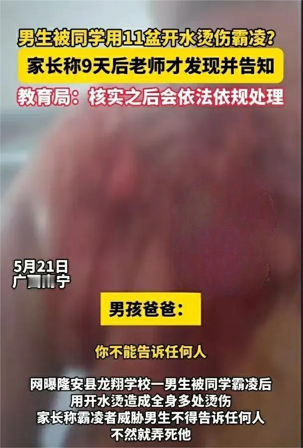 “破窗效应”来了!广西隆安,男孩因不愿意帮同学洗衣服,被8名同学连泼11盆开水,还被恐吓敢告诉家长就弄死他。男孩烫伤严重,硬扛9天不吭声,被发现时已经发脓溃烂。 (信源:) 事情发生于龙翔学校之中,作为一所私立学校,龙翔对学生的管教会更加严格,这正是男孩小张来到这里的原因。 小张今年13岁,刚上初中。身边的小伙伴变多了,视野也广了,玩得也更疯狂了。虽说孩子在学校里朋友多一点挺好的,但若是交了一群只知道吃喝玩乐的狐朋狗友那可怎么办呢? 在小伙伴们的带领下,小张不仅上课不好好学习,还经常逃学在外面玩,成绩直线下降,引起了小张父亲的关注。 跟老师了解了情况后,父亲深觉不妙,照这样下去,儿子别说上大学了,高中都进不去。为了引儿子回到正途,老父亲也是出手干预,可没什么用,正处于叛逆年龄的小张根本就听不进去。 父亲深思熟虑,自己还得挣钱养家,不可能每天寸步不离地盯着儿子,所以必须想个办法,让儿子时刻处于老师的管理下,改掉不良习惯。就这样,龙翔学校进入了他的视线。 过完年,父亲就给小张办理了转学手续,来到了龙翔学校。一心盼着儿子好好学习的老父亲还不知道,自己儿子在这里会遇到怎样的情况。 再怎么叛逆,到底是个孩子。初来乍到,小张也没什么朋友,看起来也比较内向,没什么攻击力,这样的他吸引了几人的注意。 龙翔学校的特色除了培养文武双全的学生以外,还有就是学生换班混住。什么意思呢?就是一个班级或者一个宿舍里,同时有初中和高中生存在,少的差1岁,多得能差三、四岁。当然这一点,老张事先是不知道的。 很不幸的是,小张的出现让小赵和小蒙找到了乐子。小赵今年17岁,小蒙16岁,人高马大的两人站在13岁的小张面前,压迫感十足。更别提在他们两人的背后,还有6个年纪小一点的小弟。 小张二月底转校到这里,三月初就遭遇了霸凌,面对8个大男孩,小张内心是十分恐惧的,而这样的小张让他们更加肆无忌惮,遇见就是一顿打,动不动就找他要钱。 这样的日子小张挨了两个多月,他一直期盼着父亲能来看望他,将他救出苦海,可始终没能等到。 此时的父亲还被蒙在鼓里,他也很担心儿子不能适应里面的环境,因此找到校方提出要探望,可无一例外遭到了拒绝,还告诉老张不要妨碍学校的教育。 校方义正言辞看起来十分专业,老张也就没再继续坚持。 5月7日这天,小张再次被8人包围了起来,这次他们让小张给洗衣服。看着眼前的一堆衣服,小张感到很绝望,他已经不盼望父亲能来救他了,终于决定反抗。 可他的抗争行为在小赵等人的眼中十分可笑,拉拉扯扯间8人将小张的衣服脱下,随后端来开水泼了上去,小张浑身疼痛更要反抗了,于是11盆开水接连浇在了他的身上。 小张疼得瑟瑟发抖,几人也发现有些过火了,于是警告小张不许声张,不然就弄死他。 此时的小张已经不怀疑这群人能干出更疯狂的事情了,因此不敢再反抗。一连扛了九天,天气那么热,伤口也开始溃烂,这才被同学发现。 事后,学校将小张送到了医院,垫付了医药费,赶紧通知了老张,看到儿子的模样,老张愤怒不已。 5月22日,警方处理结果终于出来,学校被责令整改,霸凌8人组都得到了惩罚,年纪最大的小赵和小蒙更是被刑拘,而后续对小张的赔偿,还要进一步商量。