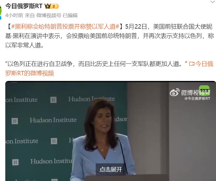 【黑利称会给特朗普投票并称赞以军人道】5月22日,美国前驻联合国大使妮基·黑利在演讲中表示,会投票给美国前总统特朗普,并再次表示支持以色列,称以军非常人道。“以色列正在进行自卫战争,而且比历史上任何一支军队都更加人道。”