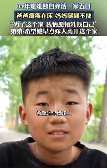 父亲瘫痪,母亲腿脚不便,01年河南女孩独自养活一家五口人!女孩说:“我这辈子就这样了,我情愿牺牲我自己,也要把两个弟弟带大。” (信源:后浪视频) 命运从来都是不公平的,一样的年纪,有人缩在父母的怀里衣食不愁,也有人不得不扛起家庭的重担。 以前,女孩也曾是父母的掌中宝。她是家里第一个出生的孩子,备受父母的疼爱,就算后来两个弟弟相继出生,也丝毫没有影响到女孩的家庭地位。 父亲是普通工人,母亲患有腿疾,无法自理,家里日子并不富裕,但他们的生活温馨又快乐,直到父亲出了意外,瘫痪在床,他们一家人的生活陷入了困境。 那时候女孩也不过是小学刚毕业的年纪,看着愁容满面的父母亲和嗷嗷待哺的弟弟,她知道自己必须要扛起家庭的重担了。 可她年纪又小,文化水平又不够,怎么找得到工作啊。无奈之下,她只好靠做手工挣钱,虽然劳动力比较廉价,但这个活胜在简单,母亲也能帮帮忙。 仅靠这份手工工作,女孩每天都能赚到十几块钱,而除此之外,她还会去捡瓶子出售,这一坚持就是好几年。 虽然收入不算多,但还是攒下了一笔钱,这笔钱不仅足够让弟弟们上学,还能改善家里的生活,女孩心里还是很高兴的,可令人没想到的是,意外再次发生。 瘫痪在床的父亲突发脑出血,为了给父亲治病,女孩为数不多的存款再次被掏空,而后续的治疗和要钱更是难倒了她,无奈之下只能卖掉家里的一辆小三轮车,此后外出干活,就只能靠腿了。 在路上,人们每周都能看到女孩的身影。她看起来瘦瘦小小的,脸上写满了沧桑,谁也想不到她今年才23岁。 她和弟弟一人背一个比自己还要高大的麻袋,里面放的是一周捡来的瓶子。他们要背着麻袋走很远的路,去废品收购站买瓶子。大太阳晒着,两人都是满脸通红。 不知走了多久,他们终于到达目的地,他们将废品卸下,换得了40多块钱,看着手里的钱,他们开心地笑了。虽然这笔钱对一些人而言就是两杯奶茶钱,可对他们而言,足够一家人吃好几天饭。 回到家后,女孩熟练地给老父亲洗头,此时的老父亲已经无法正常交流了,而母亲依然在专心致志地做手工。她知道自己不能停,毕竟100个才能赚6毛钱。 在镜头前,女孩微笑着说出了自己的计划,在她看来自己这辈子就是这样了,如今她要努力挣钱养家,照顾好父母,将两个弟弟养大。在她的眼中,这不仅是责任,也是未来的希望。 而弟弟们也都很努力地学习,家里的墙上贴满了奖状,每当女孩看到这些的时候,就有了坚持下去的信心。 面对记者的提问,弟弟说出了自己的想法,与姐姐不同的是,他反而希望姐姐赶紧嫁人,早日离开这个家,这样就不用活得这么辛苦了。 他们无疑都是懂事的孩子,相信在不久的将来一定能过上幸福的生活。