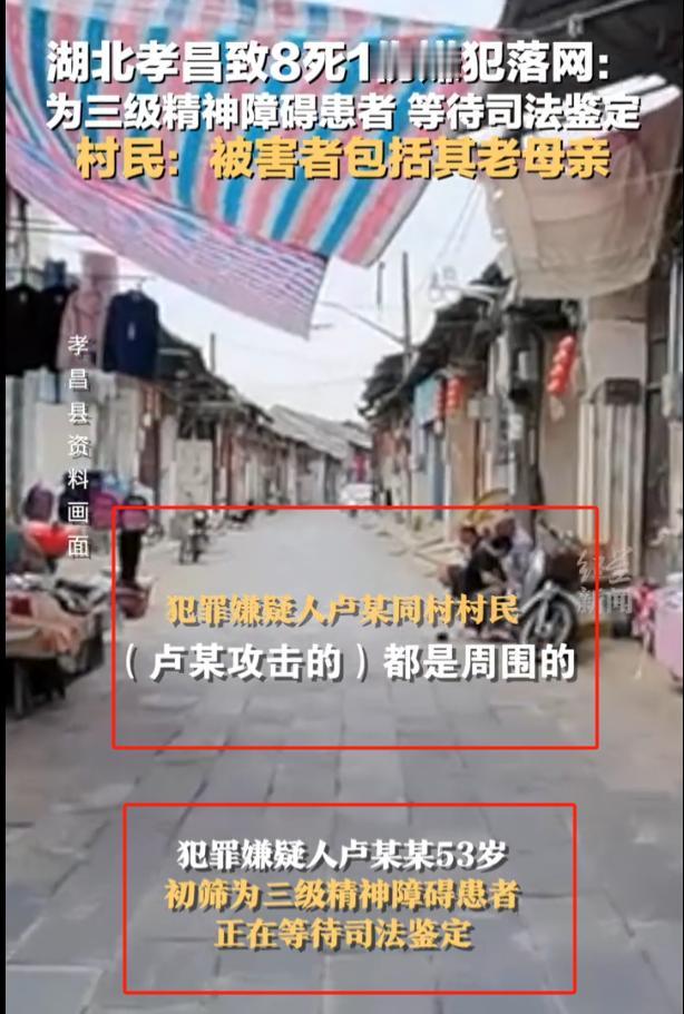 湖北一精神障碍患者持刀伤人致8死续:村民称死者包括嫌疑人80多岁的母亲 律师:其法定监护人承担责任! (信源:8死1伤!一精神障碍患者持刀伤人,死者包括其80多岁母亲——新民晚报) 卢某今年53岁,却已经有好多年的患病史了。 当年,他也是在父母的期盼中诞生,他的到来不仅是家族的传承,也意味着老两口的晚年生活将有人可依。只是,谁都没想到,卢某不知何时竟然患上了精神病。 这不但打破了父母的美梦,还让他们背负上了巨大的生活压力。尽管如此,夫妻俩还是一如既往地照看儿子,不管怎么说,终究是自己亲生的。 为了给儿子治病,他们砸锅卖铁将人送到了医院,可并没有什么用,后来只能靠着吃药稍微控制一下。 虽然卢某患有精神病,但也是时好时坏,不犯病的时候倒也好不错。而夫妻俩又将自己的全部身家都交给了儿子,终于给儿子娶了个媳妇。 幸运的是,儿媳妇给他生下了一个正常的儿子,终究是给了卢家传承的希望。然而就在他们以为事情好转的时候,卢某的妻子去世了。 老两口不仅要照顾年幼的小孙子,还要照顾不定时发病的儿子,日子过得十分辛苦。 一开始还稍微好点,儿子虽然患上了精神病,但不怎么惹是生非,一家人过得也算安稳。可随着年纪的增长,或许是病情进一步加深,卢某的脾气变得越来越差,性格也十分暴躁。 每次犯病时,卢某都会跑出去跟人纠缠一番,口齿不清的,也没人知道他想干嘛。虽说从来都有没有伤过人,但久而久之,附近的邻居看到他也会躲得远远的,毕竟不知道他下次犯病是什么时候,会是什么样子。 日子就这么相安无事地过下去了,直到今年5月23日。 此时的卢某已经53岁了,而父母也都头发花白,因为要供小孙子读书,卢某的父亲每日都要外出干活挣钱,而老母亲则留在家里给儿子和孙子做饭,管理家务事。 23日这天,老卢像往常一样出去干活,但他不知道,这将会是自己最后一次吃老伴做的饭。 不知受到了什么刺激,卢某突然拿起厨房里的大刀来到了母亲的面前,大手一挥,母亲就倒在了血泊之中。 随后,卢某冲出了门,跑到了邻居家中。刚看到他,邻居还不知道发生了什么,可一看到卢某掂着刀,身上还沾了血,立马想跑,但是已经来不及了。 就这样,邻居一个接一个倒下,也有人试图反抗,可惊讶地发现力气压根就比不过此时失了神志的卢某。 都说软的怕硬的,硬的怕不要命的,此时的卢某正是这个不要命的。一连砍了9个人,卢某终于被赶来的民警和邻居们一起压了下来。 大家这才发现,这场悲剧中,就连卢某的母亲也没能幸免于难。 都知道,精神病做出一些行为是不用付法律责任的。但其实,这还得看这人干坏事的时候,有没有犯病。 按照以往来看,卢某犯病只是虽然比较焦躁难缠,但并没有伤人的例子,因此很有可能这次卢某并不在发病状态,若真实如此,那就是恶性伤人事件了。 目前,卢某已经被初步确定是三级精神病,而三级的表现基本是出现打砸行为,跟卢某的杀人行为显然是不同的程度。 最后的鉴定还没有出来,大家觉得卢某的结局会是怎样的?