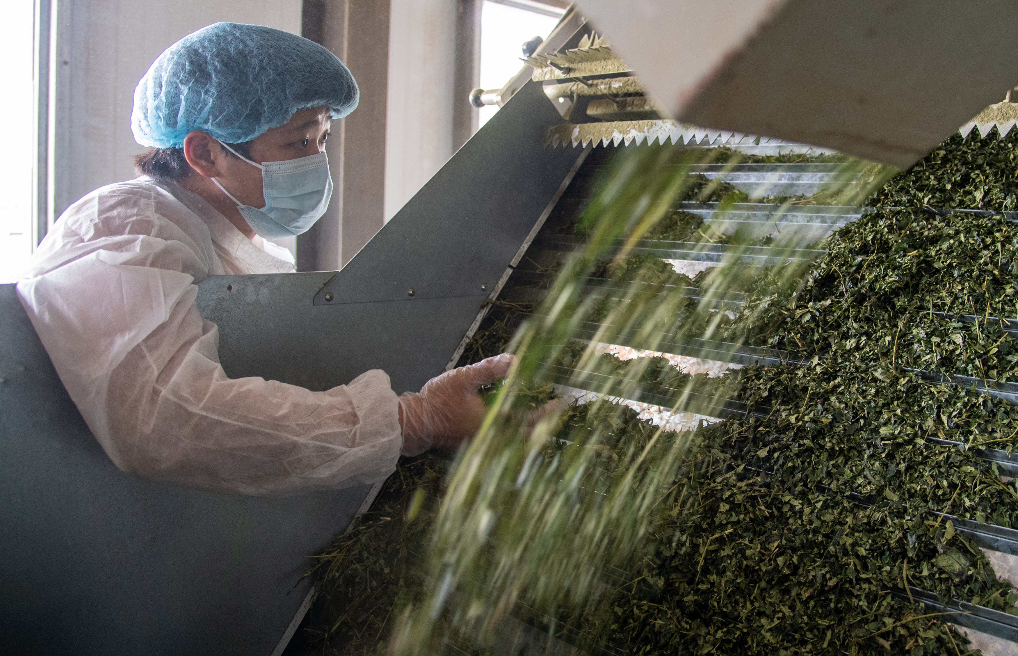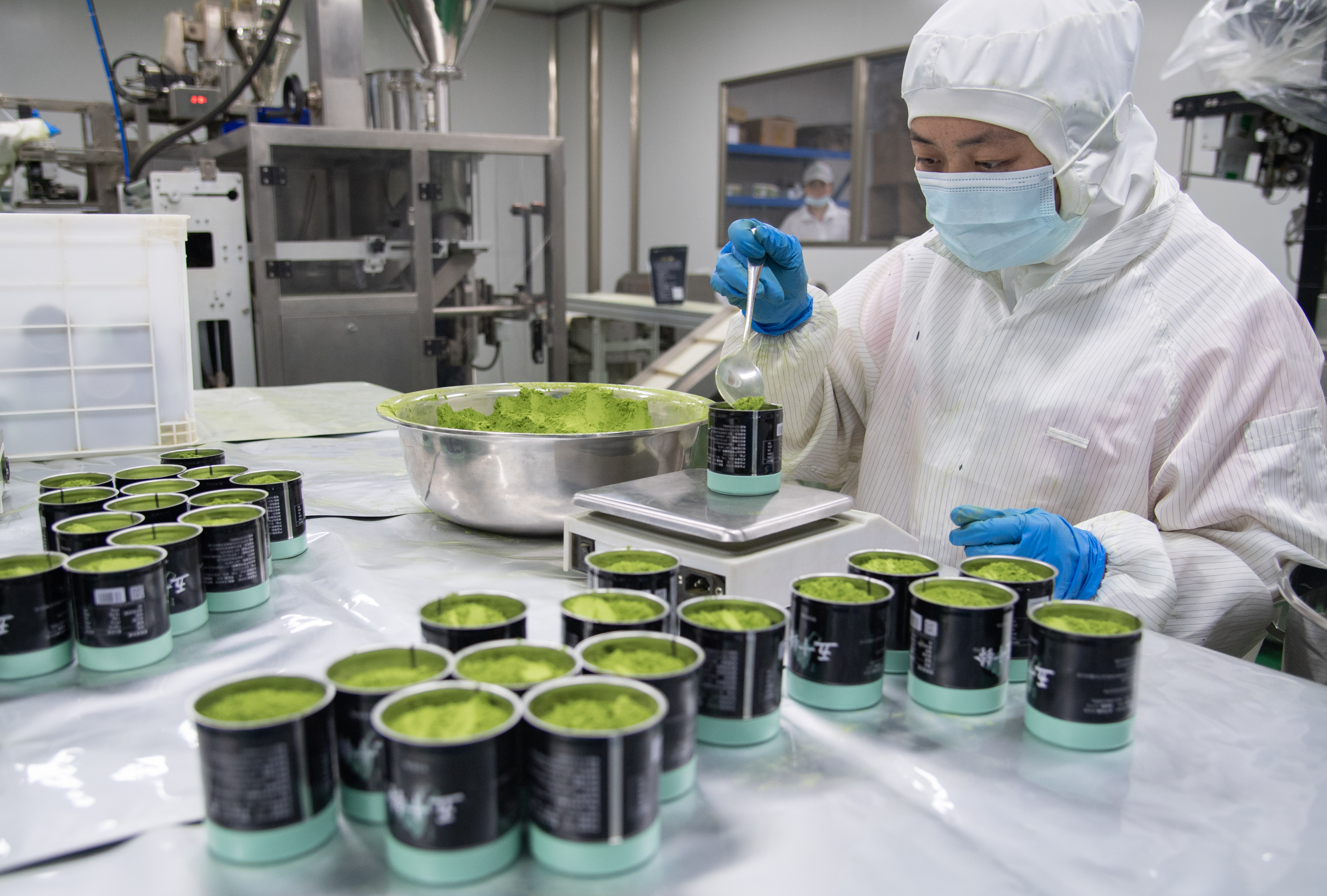 种植端科学有道,生产端工序严谨。在抹茶初加工车间,工人将一车车刚收获的鲜叶倒入储青仓,后续经过蒸汽杀青、烘干、叶梗分离、静电除杂等自动化工序,形成制作抹茶的原料碾茶;在精加工车间,碾茶分别在石磨、球磨、气流粉碎等不同工艺的处理下,最终变成颗粒极小、深绿细腻的抹茶。通过搭配生产,抹茶还被制作成咖啡、奶茶、糕点、冰淇淋等多种饮品和食品,备受青年消费群体青睐。