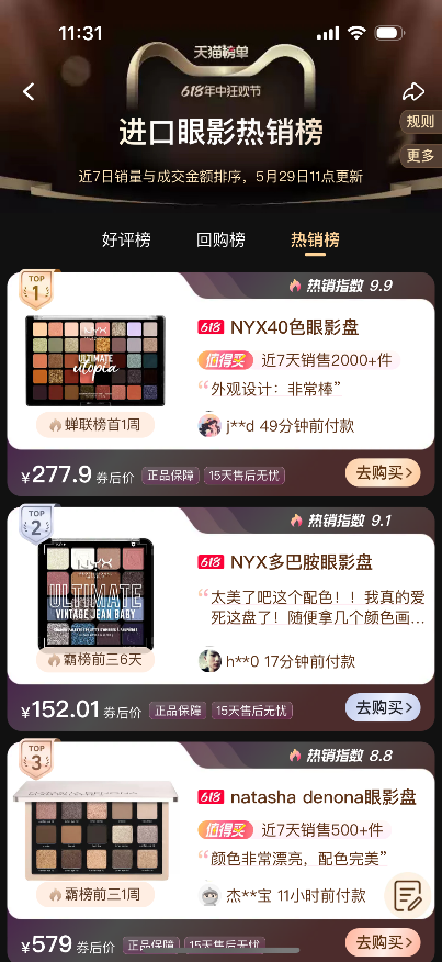 从天猫国际店铺当前的618活动看,NYX16色眼影盘目前售价158元,销量3万+。NYX40色眼影盘售价287元,销量1万+,并且霸榜天猫榜单进口眼影热销榜第一第二。目前,店铺内共有20款SKU,均在参加618活动。