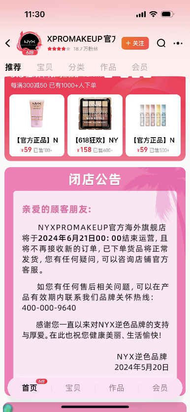 近日,欧莱雅集团旗下的美妆品牌NYXPROMAKEUP(以下简称“NYX”)淘宝官方海外旗舰店发出了闭店公告:“即将于2024年6月21日00:00结束运营,且将不再接收新的订单,已下单货品将正常发货,有任何疑问,可以咨询店铺官方客服。”