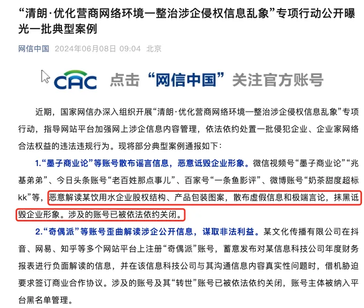 消息显示,今年6月份,“网信中国”通报了典型案例,一批造谣农夫山泉的社交账号被封,包括微博、抖音、百家号等平台的账号。通报的这些账号涉嫌恶意解读农夫山泉企业股权结构、产品包装图案,散布虚假信息和极端言论,抹黑诋毁企业形象。