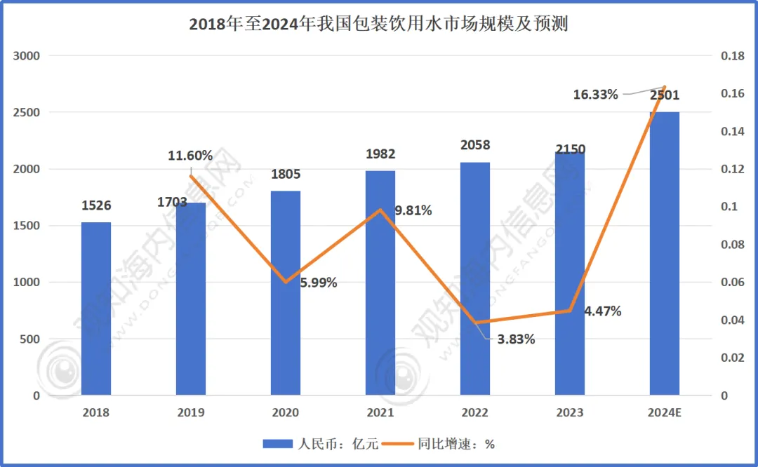 因为此前根据多家研究机构预测,中国饮用水市场正处于高速发展阶段,无论是市场规模还是市场需求,都呈现出极为广阔的发展空间。据观知海内信息网的数据,从2018年至2023年,中国包装饮用水市场规模正在逐年递增,年均增长率达到7.14%,并预计2024年中国包装饮用水市场规模达到2501亿元,同比增速预计达到16.33%。