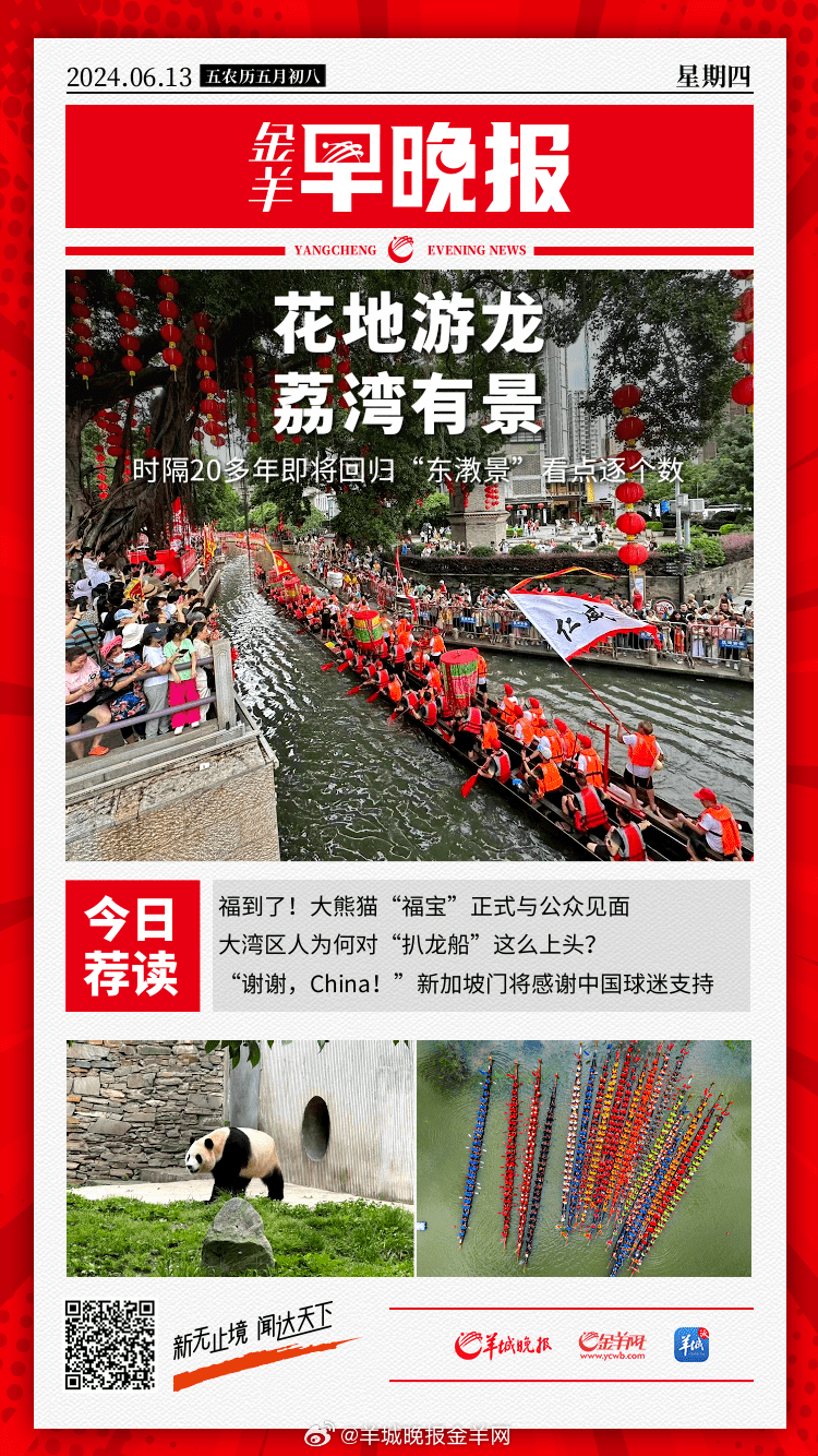 #金羊早晚报# 大湾区人为何对“扒龙船”这么上头?中国自主研制!HH-100商用无人运输机首飞成功;福到了!大熊猫“福宝”正式与公众见面;学生网购演出裙穿完再集体退货,校方:向商家致歉并协商解决;三亚网信办回应“快艇把身体不适游客直接丢海里”:视频内容失实;精彩抢先看!时隔20多年,广州荔湾“东漖景”将在花地河开锣;广州荔湾龙溪中路、海北三街于12日24时开通;千年肇庆宋城墙,一座砖的博物馆,肇庆的府城复兴迎来契机;广州将全勤打卡6天!南方大部陷入降雨车轮战;紧急提醒!雷电、狂风、暴雨、冰雹将袭击多省,为什么今年强对流天气这么多?上戏回应林更新成功考上博士:确为演员林更新,招生合理合规;“谢谢,China!”新加坡门将感谢中国球迷支持;巴黎奥运会地标性建筑正在华丽“变身”;美以存分歧,美为自身利益推动实现加沙停火;印度高温天气持续,东部奥迪沙邦至少41人因高温死亡。#高考报志愿要了解的16个关键词##学生篡改7名同学高考志愿获刑1年半##妈妈让28岁未婚未育女儿回家啃老##南京咖啡阿姨说天下没有不散的筵席# 更多精彩报道,请扫码关注羊晚全媒体报道!