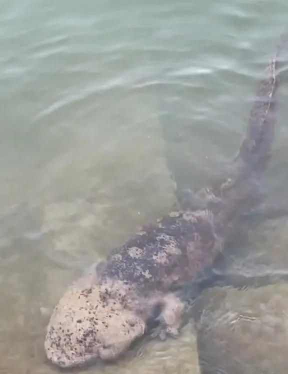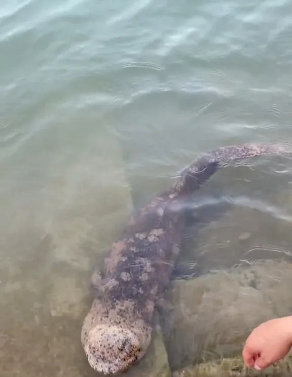 这种情况,让人有点捉摸不透!后来还是人下水,帮助它改变了方向,这才回到水中!这一幕,被手机拍了下来,后来也发到网络上来了!没想到,这条视频,引起了大家的热议!
