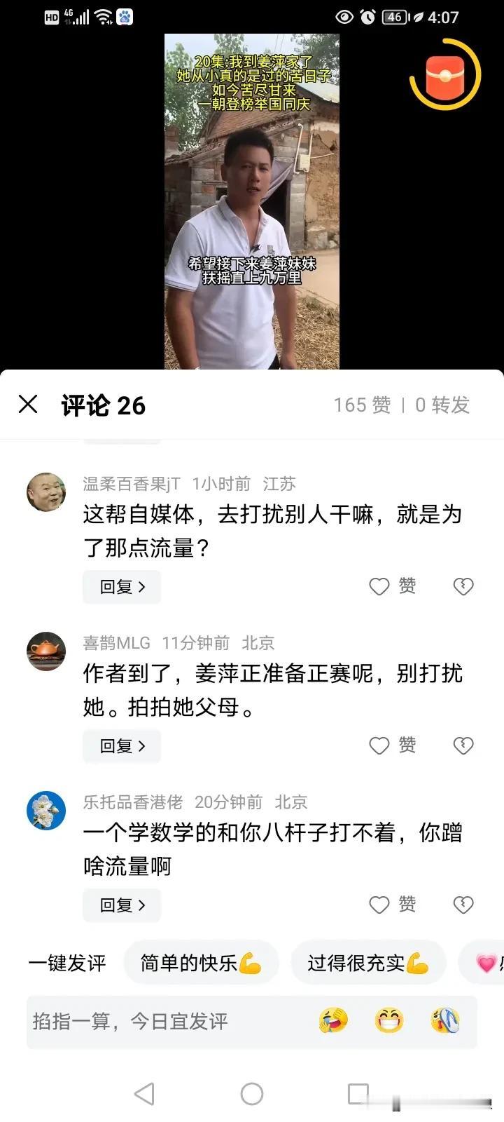 现在的自媒体真恶心,姜萍因为进入阿里巴巴数学竞赛大火,很多网红和自媒体私自跑到人家家里说要拜访,吓到姜萍爸爸都躲起来了! 就这个男人,他开着车提着95块钱的东西说要去姜萍的家里,一路拍了十几个合集,尤其是在人家院子里面拍了好久。 而根据星视频报道,村里面涌进了很多做自媒体的,都跑到了姜萍家里打卡,而姜萍的姐姐在连云港,一天打三份工的她因为担心父亲,连夜赶回了家里看了下,第二天又出去打工了。 而姜的父亲一大早就把家里的门都锁上了,干脆就躲了起来,都不想去接待这些来蹭流量的。 真的建议那些自媒体,网红等不要去她家,每个人都要面子,要学会尊重别人,不要太自私,为了那点流量不管别人死活!不要去打扰人家的家人,姜萍正在备赛,这样子做反让姜萍担心父亲,让姜萍安心学习决赛吧!