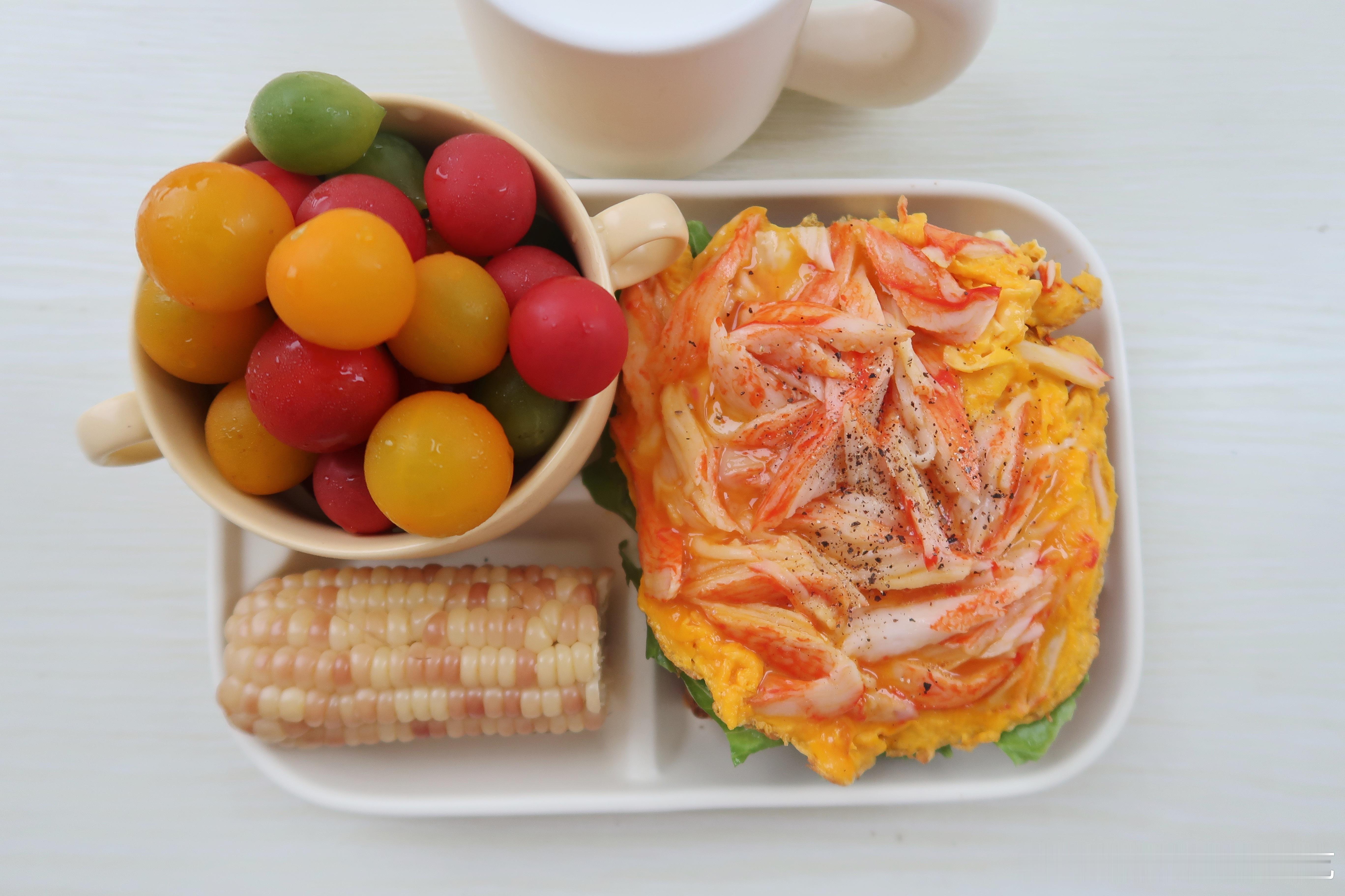 早.今天的早餐蟹柳滑蛋吐司🍞糯玉米🌽小番茄🍅牛奶🥛
