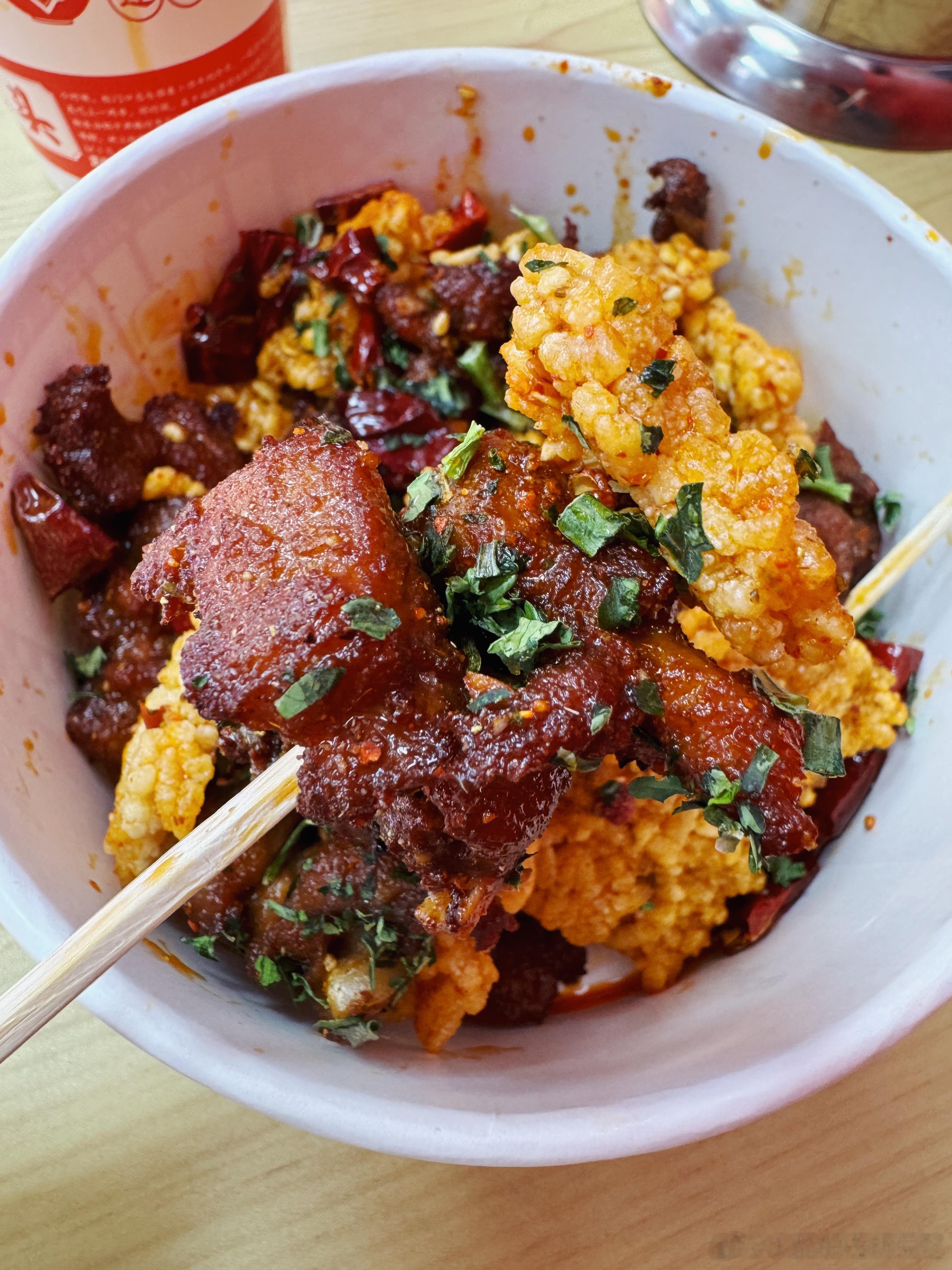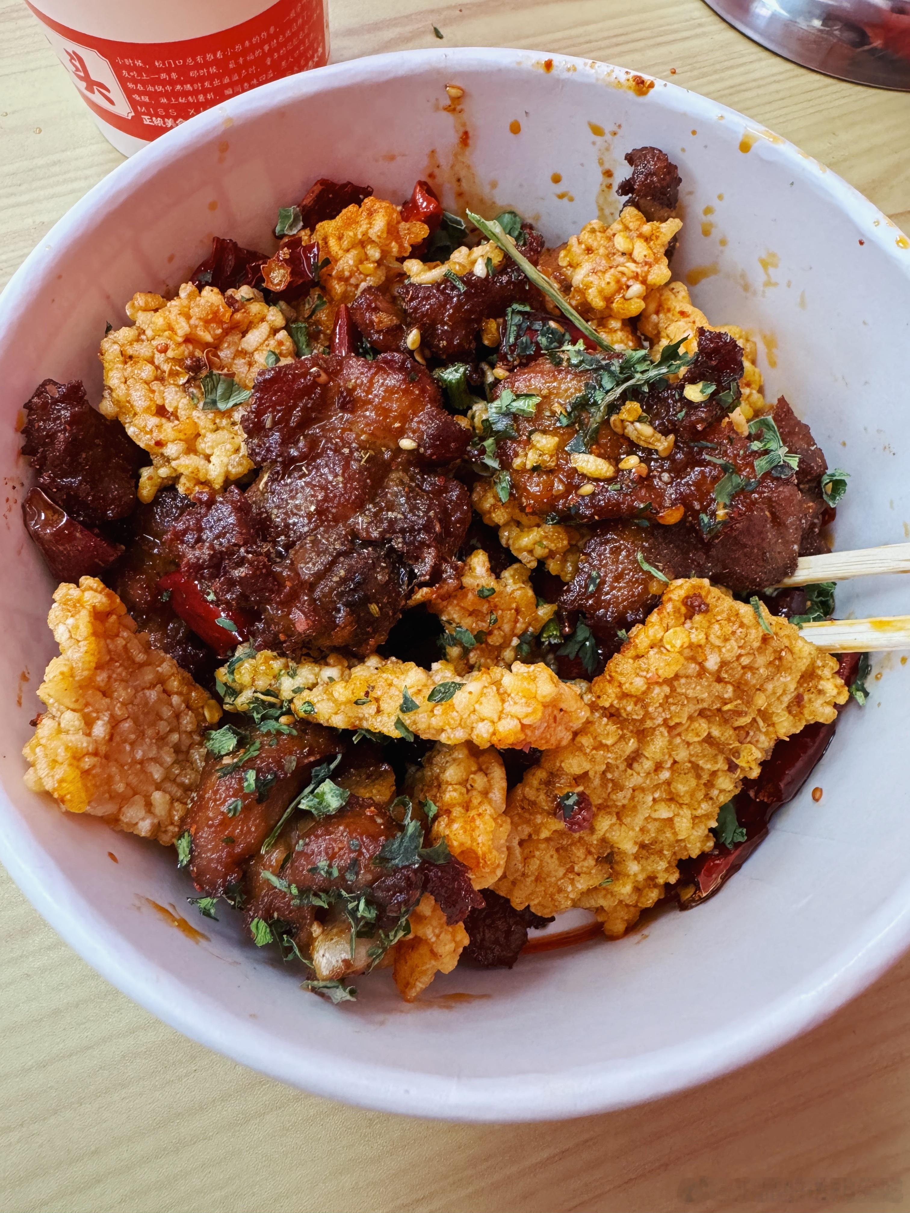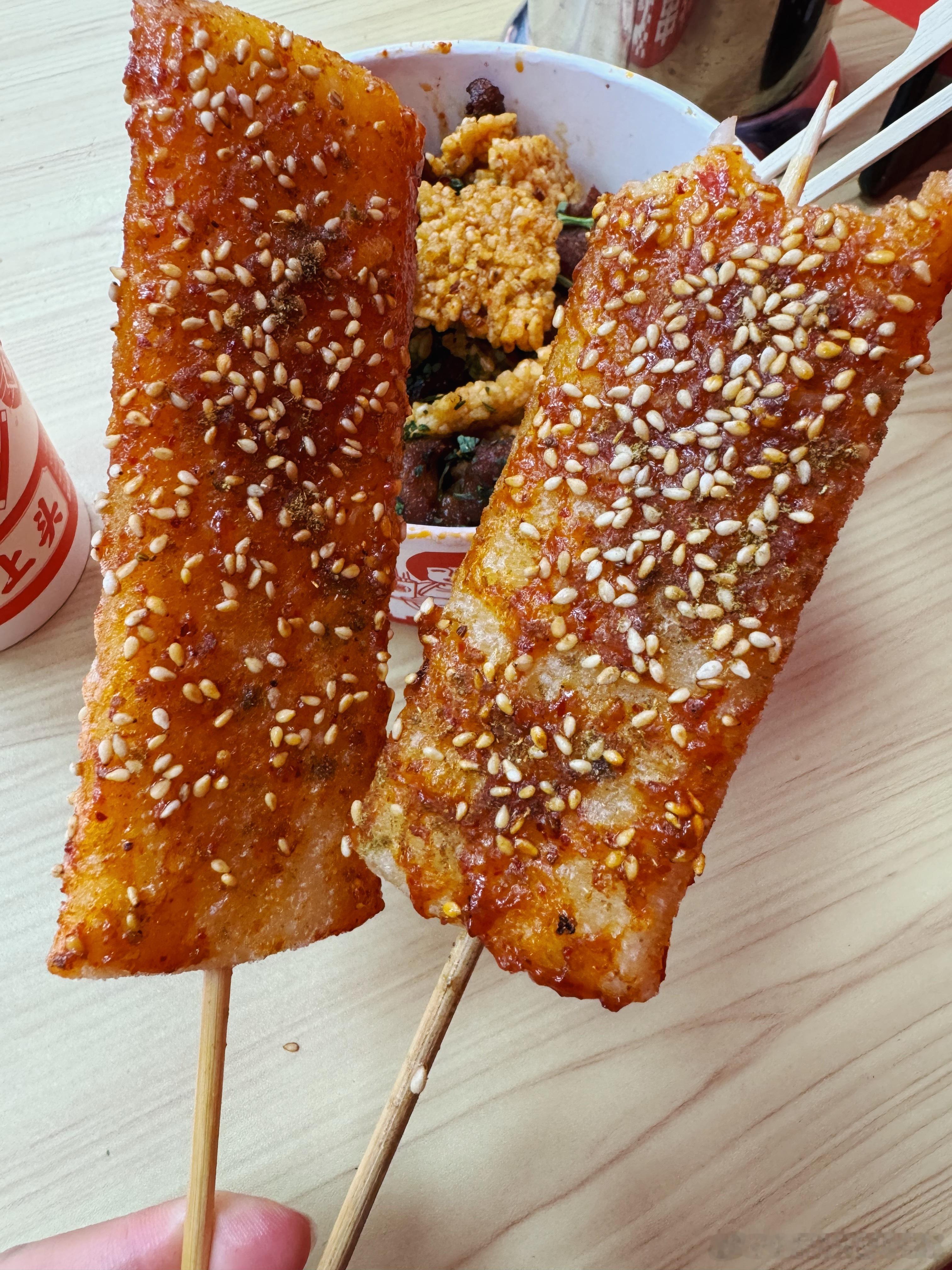 喜姐炸串的烤年糕软糯好吃.锅巴辣子鸡也不错,锅巴香香脆脆的.#好好吃饭##消暑饮