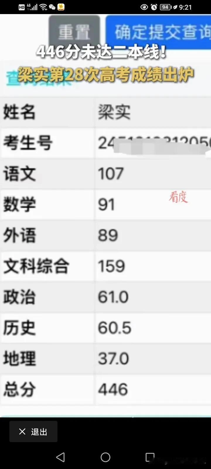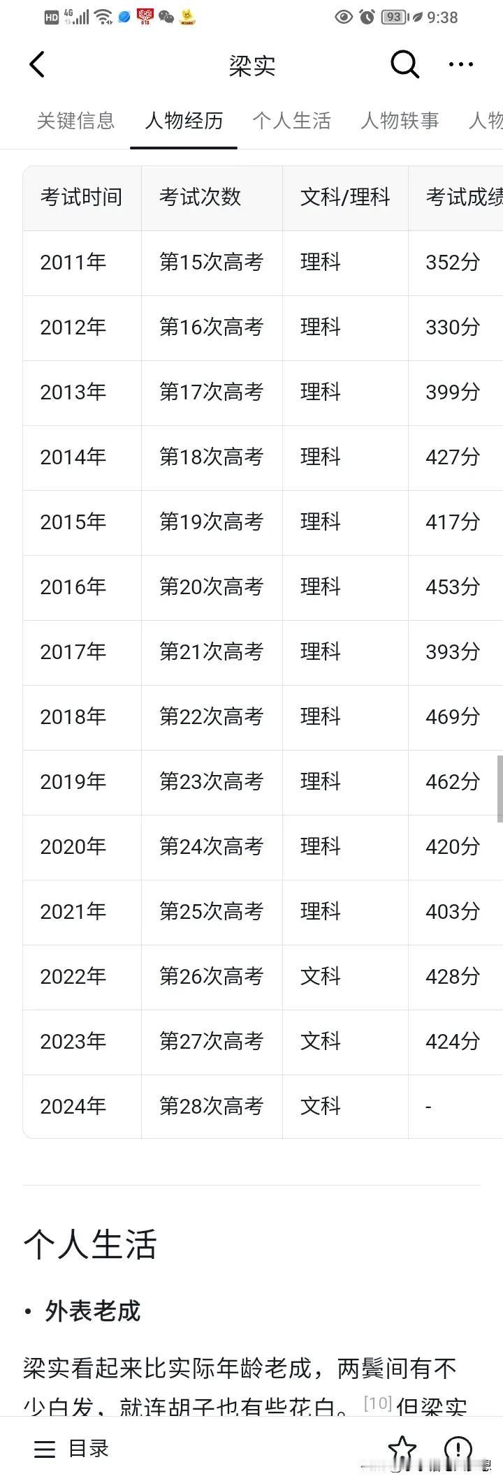 高考钉子户梁实第28次的高考成绩已出炉!他从1983年就开始多次参加高考,从2022年就改考了文科,今年58岁的他成绩出来之后只有446分,离二本线还差11分,真的非常的遗憾,他一直想要上四川大学,但是他也知道自己可能考不上,因为在高考后他给自己估过分,应该可以上个二本,而且他也说过,如果上二本线,他就去读!但没想到二本都没上线,这一次又无望了! 我看了他最近这些年的成绩,分数在300多~400多,他去年考了424分,今年446分确实比去年好了一点点,但是说实话,区别并不大,虽然坚持了28年,不容易,但事实证明他真不是学习这块料!这个真的是要讲天赋的! 今年58岁了,可以说已经快退休的年纪了,就算但他考上个二本,再读几年?那还能对社会有多大的贡献? 他一直这么做,可能真的是放不下大学这个梦,因为他爸妈就是小学老师,但是因为自己没考上大学,他想证明自己?