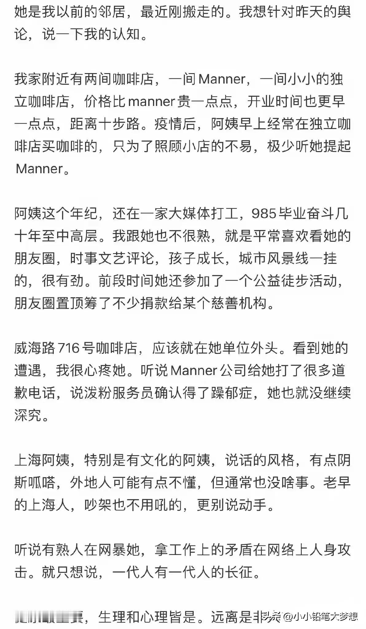 上海被泼咖啡粉女士的前邻居发文称被泼的女士就职于上海一家大型媒体,985奋斗几十年做到了中高层,这次买咖啡真的是遇到了躁郁症! 这位女士的朋友圈经常置顶帮忙筹款的信息,被泼咖啡粉的事情过后,该公司也给她打去了很多道歉的电话,她也没有深究了。这位邻居还说,阿姨就是个文化人,阿姨说话的那语气是老上海的风格,外地人可能有点不懂。 说实话,这个泼咖啡粉的整个完整视频我都看,这个被泼的女人素质还是高的,这个服务员真的是歇斯底里的,还好服务员泼的不是开水,阿姨其实全程都在克制,说实话,如果换作别人,面前这么多器具早砸过去了,服务员完全就疯了,连他旁边的服务员都看不过去,都说她:“你是不是疯了?” 当然,事情被爆出之后,也反映了这家连锁店的管理问题,真的是资本家的剥削压榨!工人马不停蹄干活,就没有喘口气的时间,这就是打工人的现状,明明是经营策略有问题,非得打工者买单。 这属于超负荷经营,网络订单应该优先级低于门面订单,网络订单可以自由取消订单,以至于由于长期无法完成订单而关闭,现场服务绝对不可以降低服务质量。 生活压力,劳动强度造成服务员心理不健康了,这样的个人小店基本无休,营业时间又长,老板经营成本高,压搾到员工无力忍受了,心理压力己到临界点,刚好碰到事就一下爆发了!