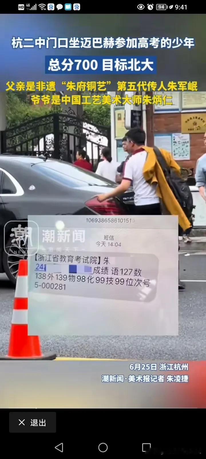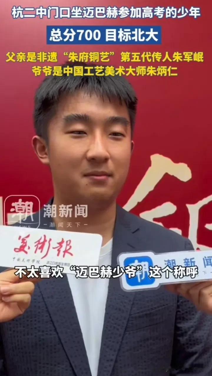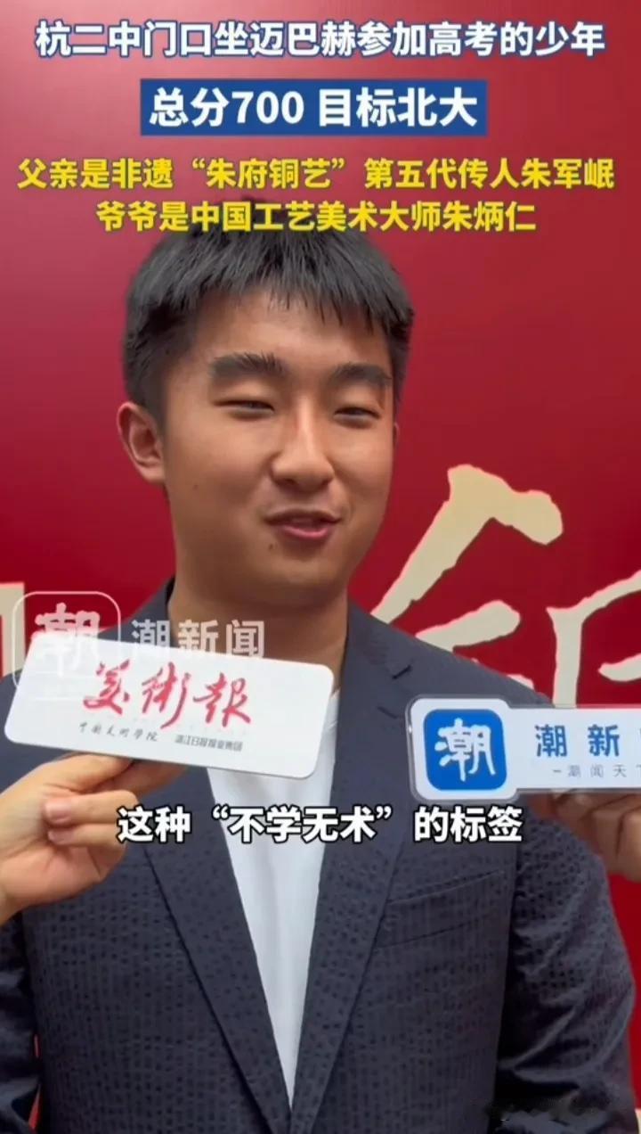 刚开始看到新闻报道杭州二中坐迈巴赫参加高考的男生我第一感觉就是哇,好有钱啊,但不知道成绩怎么样?但没想到现在成绩出来了,真的不得不佩服这样的家庭! 杭州二中高考当天,朱也天因为坐着迈巴赫来参加高考受到热议,网友们纷纷说,又是一个富家二少爷,开着这样的车来学校门口是炫富还是作秀? 但是后来他的身份被爆出之后,确实惊呆了众人!他迈巴赫少爷的身份变成了非遗传承的少爷!原来他的父亲是非遗“朱府铜艺”第五代传人朱军岷,爷爷更是不得了,是中国工艺美术大师朱炳仁!百科光是介绍老爷子的作品和成就,就已经吓死人了! 但没想到这位少爷不但有钱,有颜,还有实力,这次高考他拿了700分,语文127、数学138、英语139、物理98、化学99、技99,总分700分! 他谦虚的说,不是很高的分数,不喜欢“迈巴赫少爷”这个称呼,自己也在努力摘掉这个“不学无术”的头衔,他说自己的目标是北京大学,很多人说这个分数上北京大学可能有点悬吧,但是他是全国化学竞赛金牌得主,有加分的上北大是稳了! 其实想了想,真的是觉得挺恐怖的,可以这么说吧,有钱就算了,还是个学霸;是个学霸也就算了,人还长这么帅;人长的帅就算,还这么有素质;这么有素质就算了,还这么有见识;这么有见识就算了,还这么努力! 本来他生在这样的家庭就衣食无忧了,还有那么厚的文化底蕴,这真的是一家三代人传承的是一种强者恒强的精神,这种家庭的子孙后代都不会差,这让普通的家庭怎么超越?