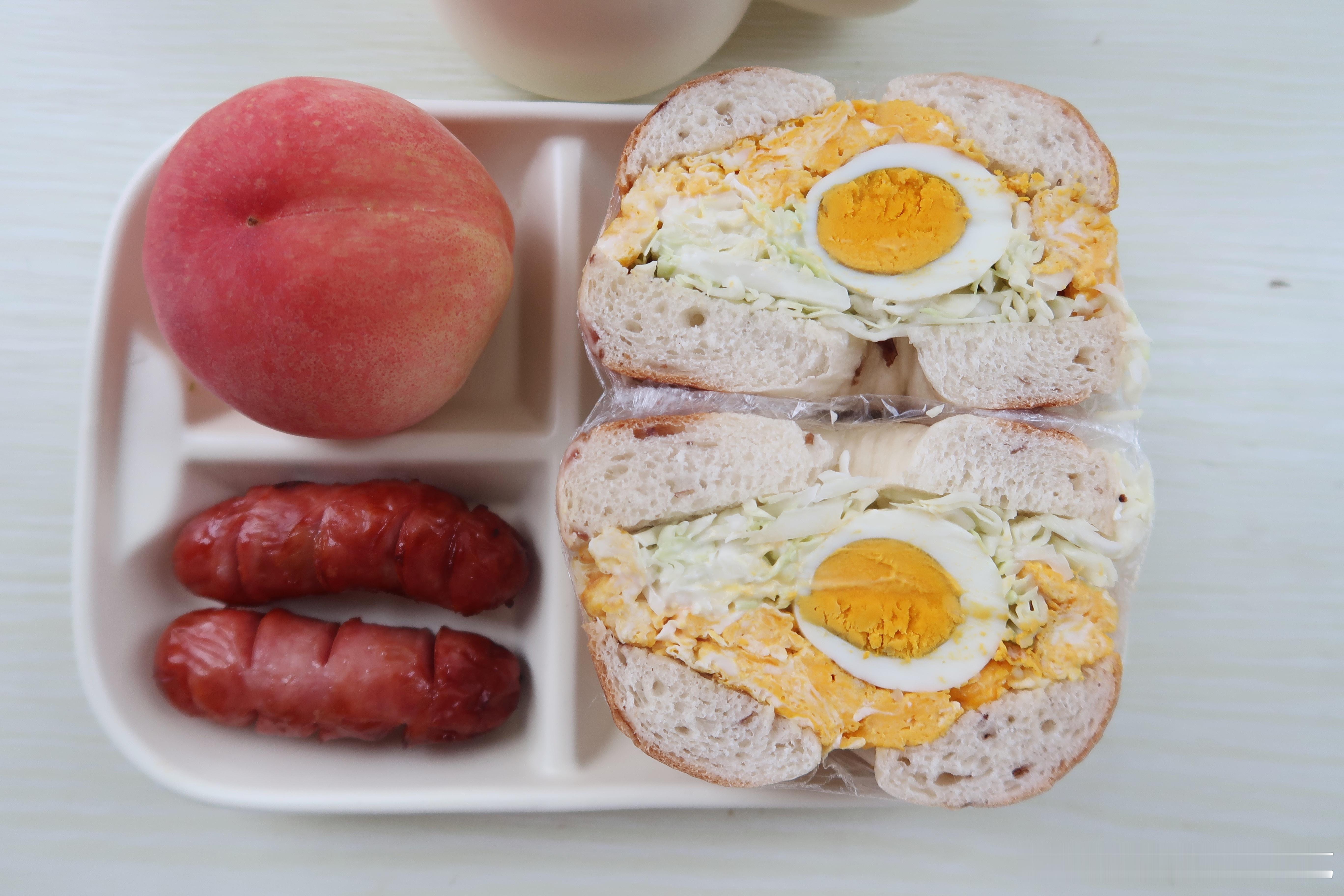 早.今天的早餐是卷心菜鸡蛋贝果🥯烤香肠🥩水蜜桃🍑牛奶🥛