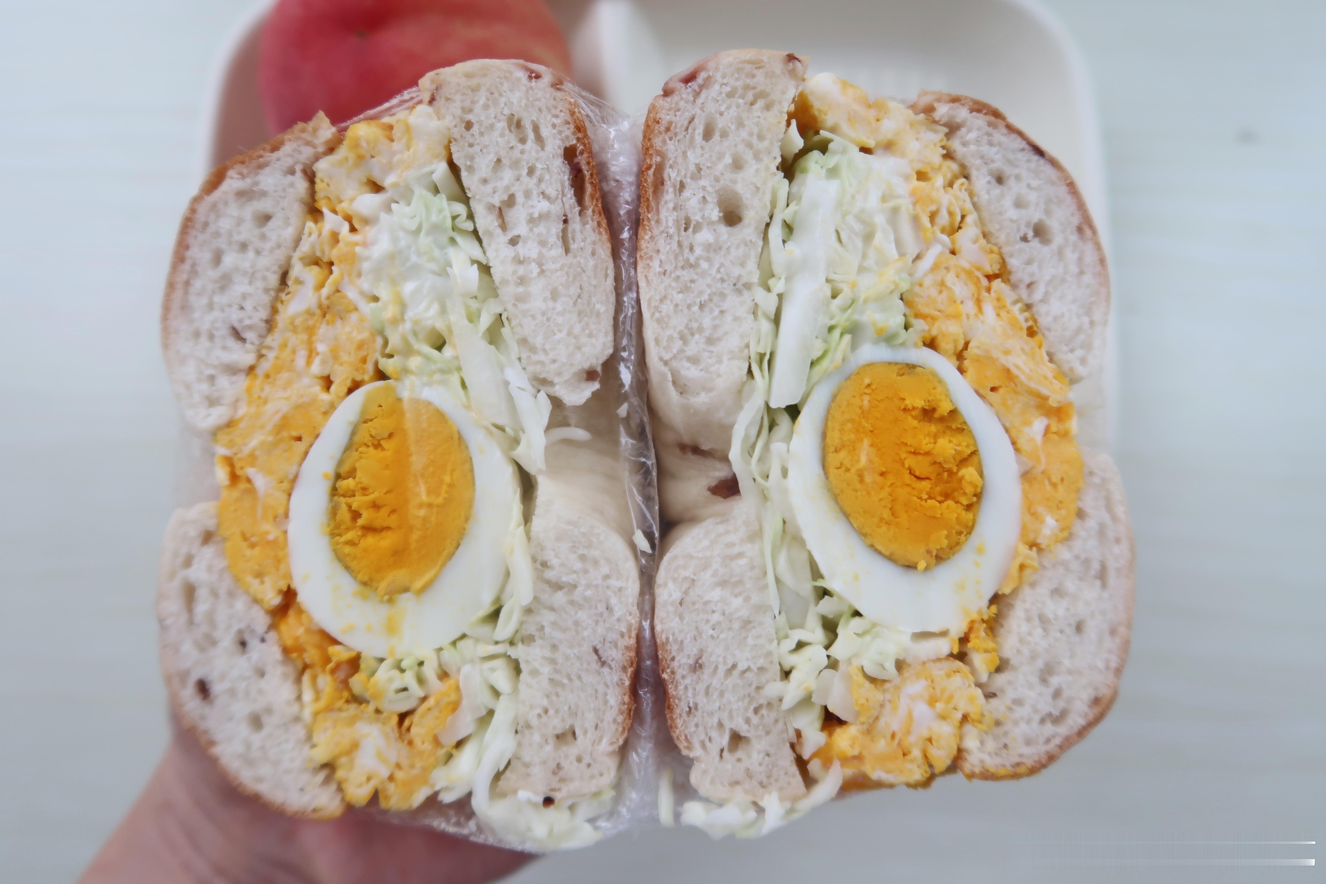 今天吃卷心菜鸡蛋贝果,卷心菜色拉的口感太喜欢啦,清新爽口,搭配三明治贝果都特别好吃.