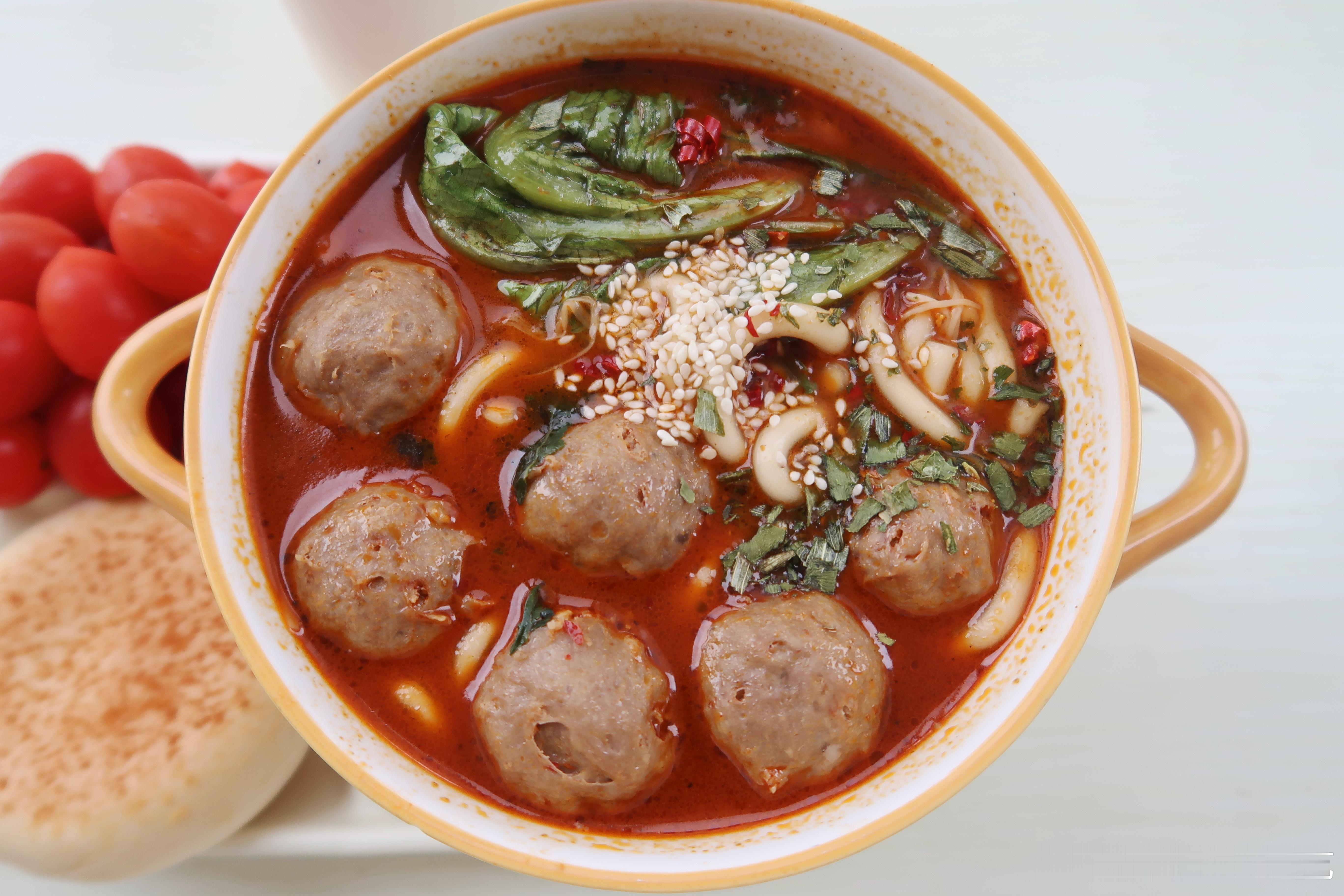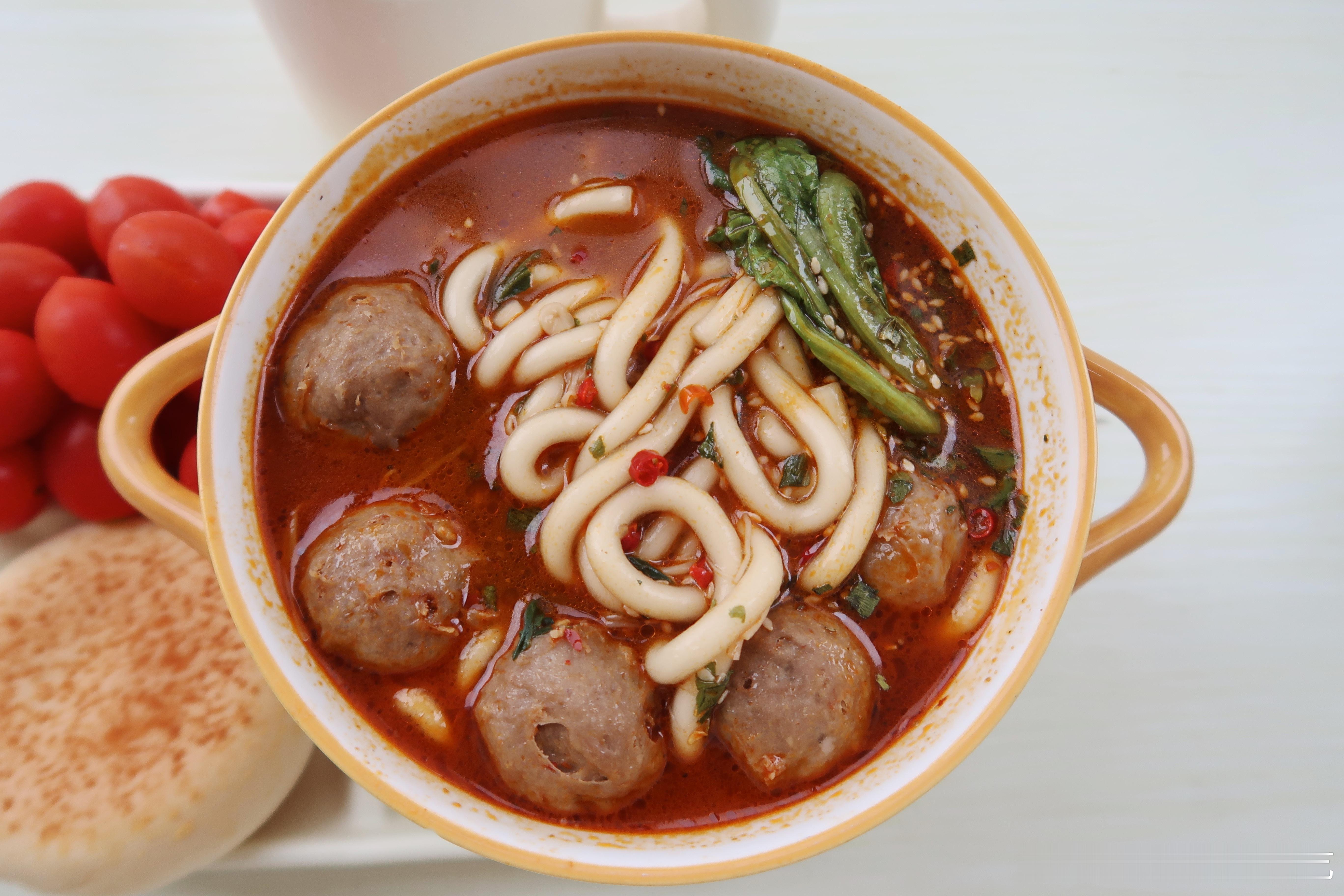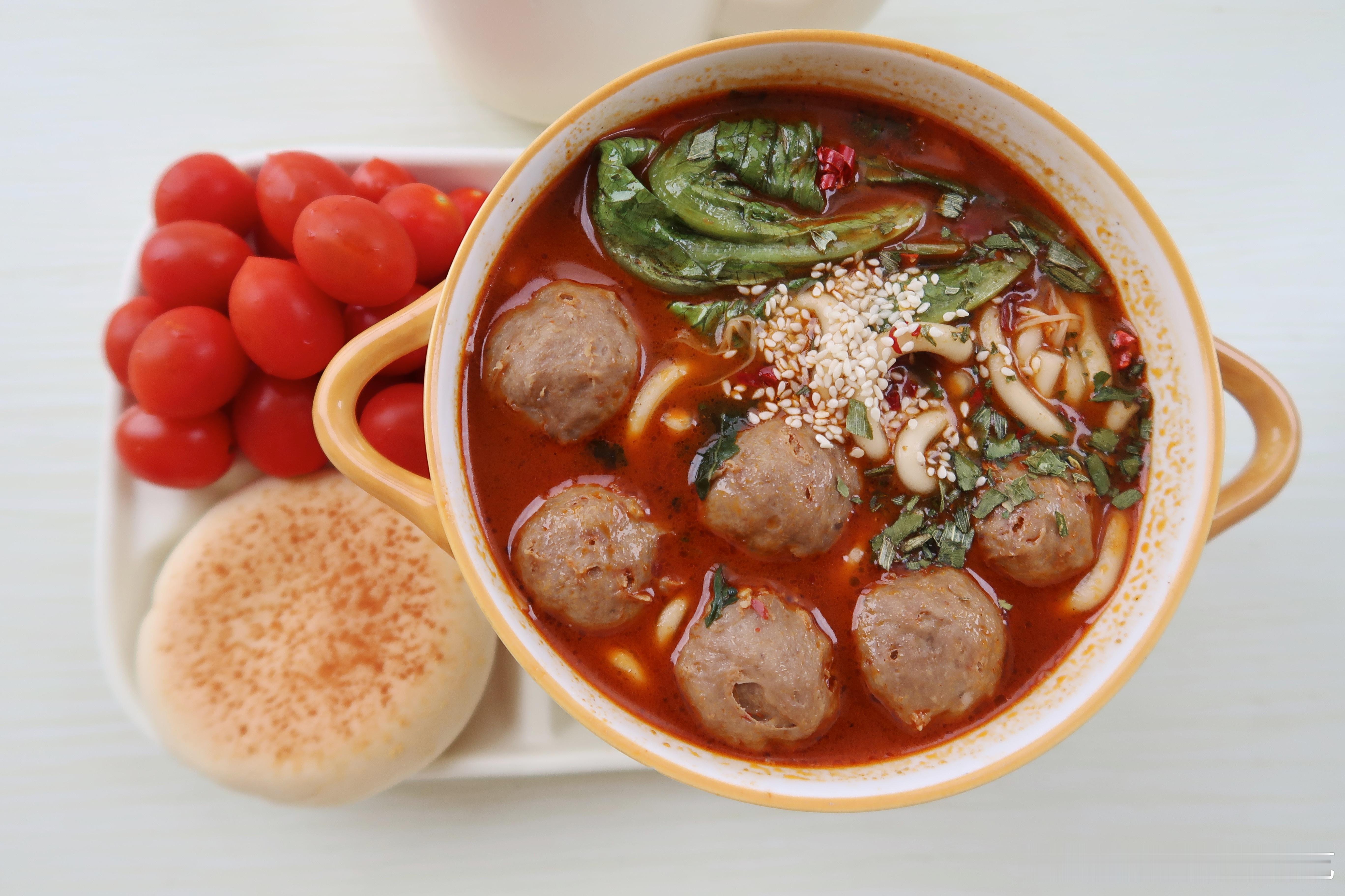 周末早.今天的早餐是牛肉丸土豆粉🍜豆乳面包🥖小番茄🍅牛奶🥛