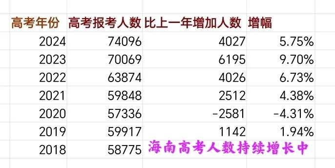 海南“高考事业”一片繁荣、人数井喷:从2021年的59848人(不足6万)猛增至2024年的74096人,年增加量均在4千以上!三年间高考人数增加14248人,增幅23.8%,全国仅有!这一定程度上反映了海南自贸港建设“人才济济、蒸蒸日上”! 与之相呼应,海南“中考事业”也是一片“欣欣向荣”的景象: 2024 年,普高招生计划数83372人,中考报名人数135931。 2023 年,普高招生计划数76348人,中考报名 人数130484。 2022 年,普高招生计划数72391人,中考报名人数 124733。 #高考# #高考志愿填报# #中考# #高考移民# #中考移民#