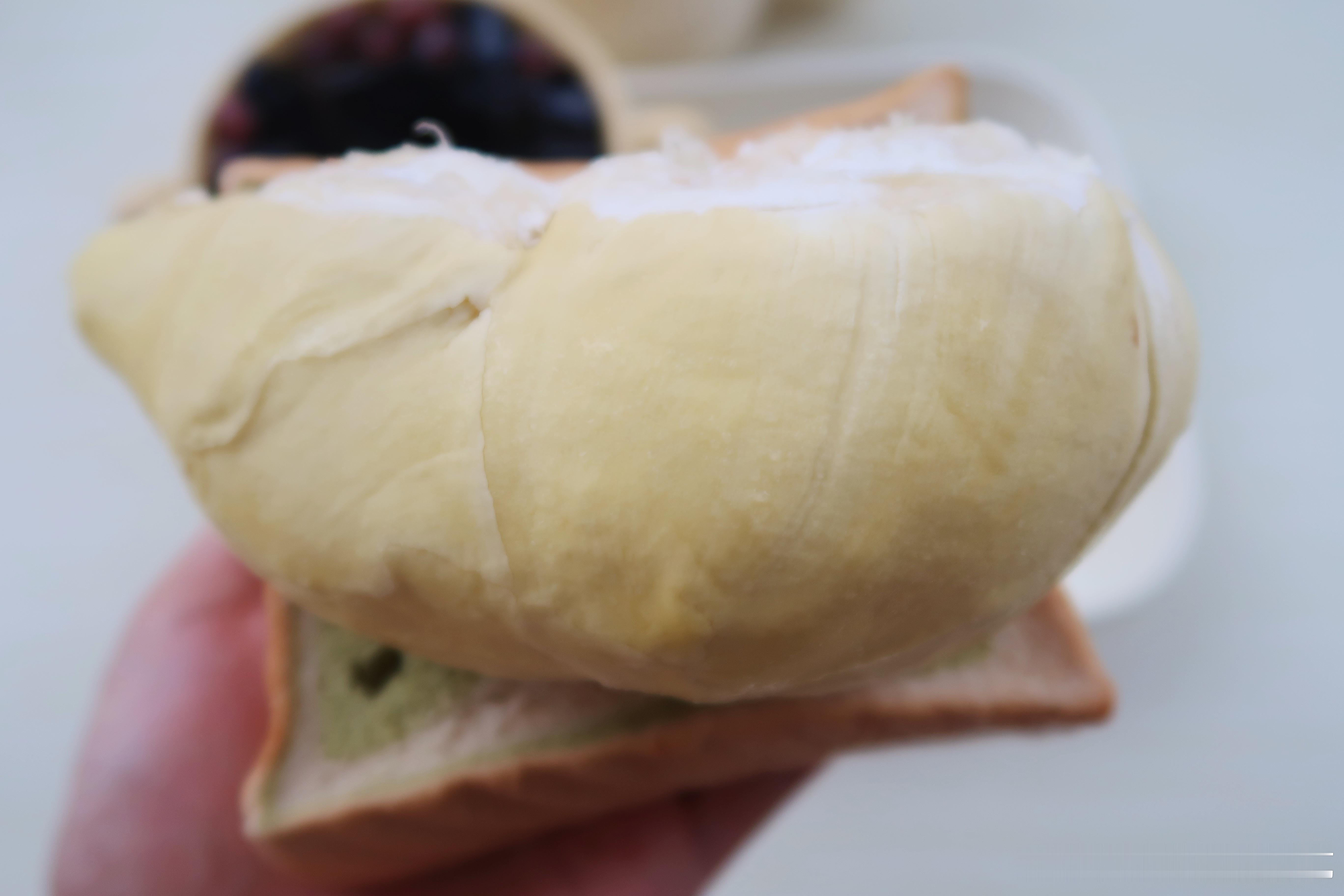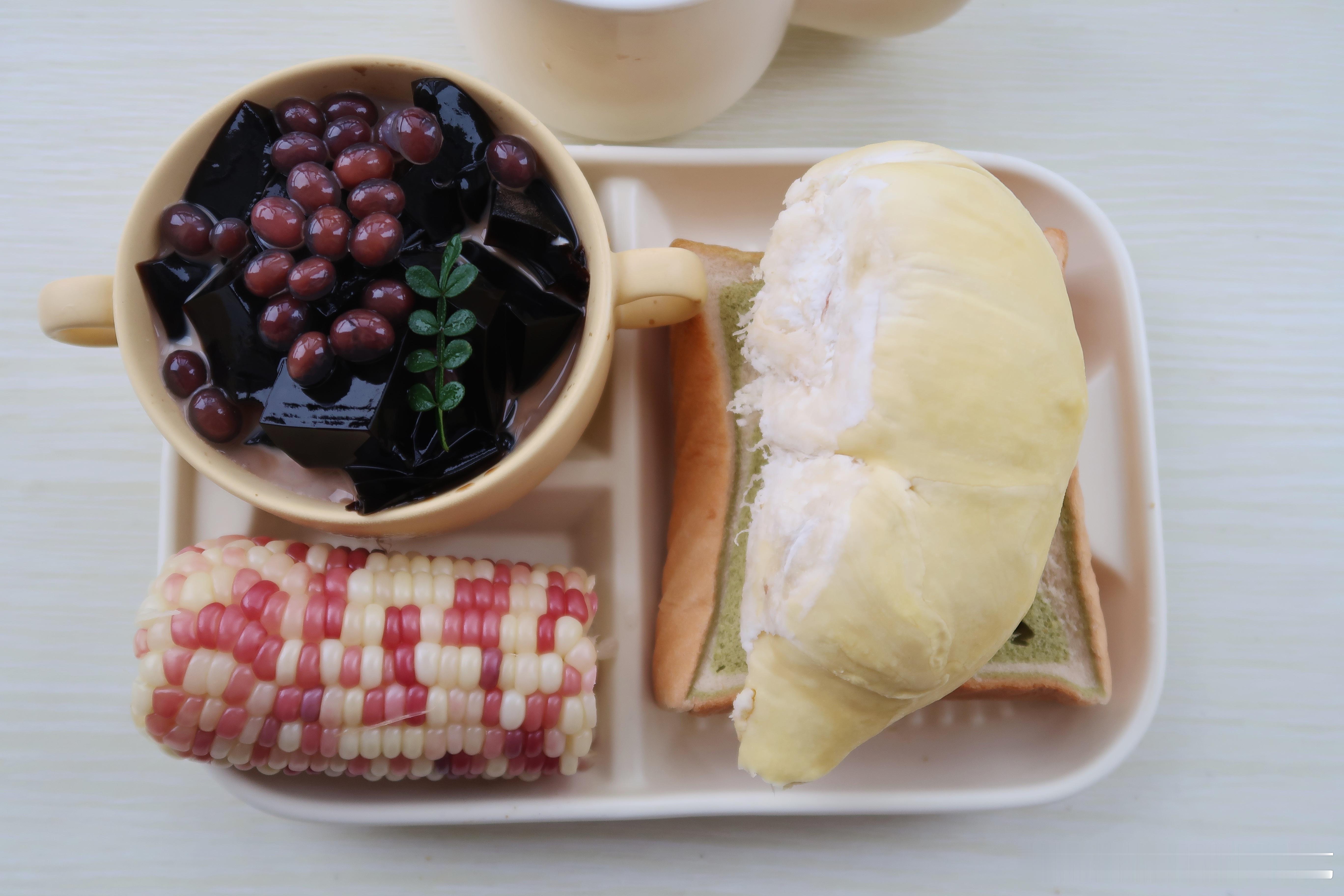 分享早餐.今天单位早餐是一份榴莲斑斓吐司🍞红豆烧仙草🍧玉米🌽拿铁☕️