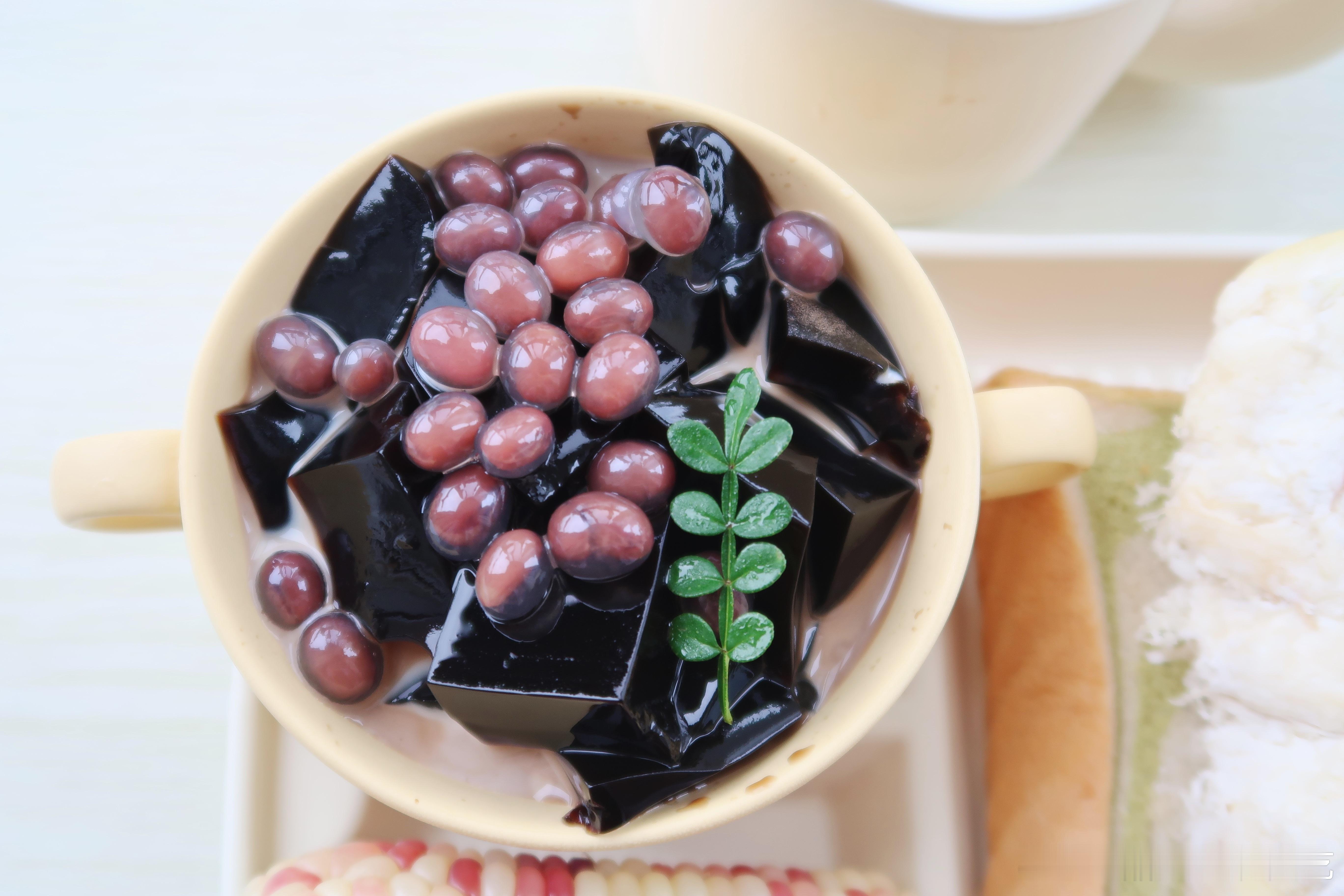 今天吃榴莲斑斓吐司,斑斓吐司上放上大块榴莲果肉,空气炸锅200度8分钟,榴莲控太喜欢啦.做了红豆烧仙草,仙草冻提前做好,放上红豆爆珠,加上牛奶和炼乳,很好吃.