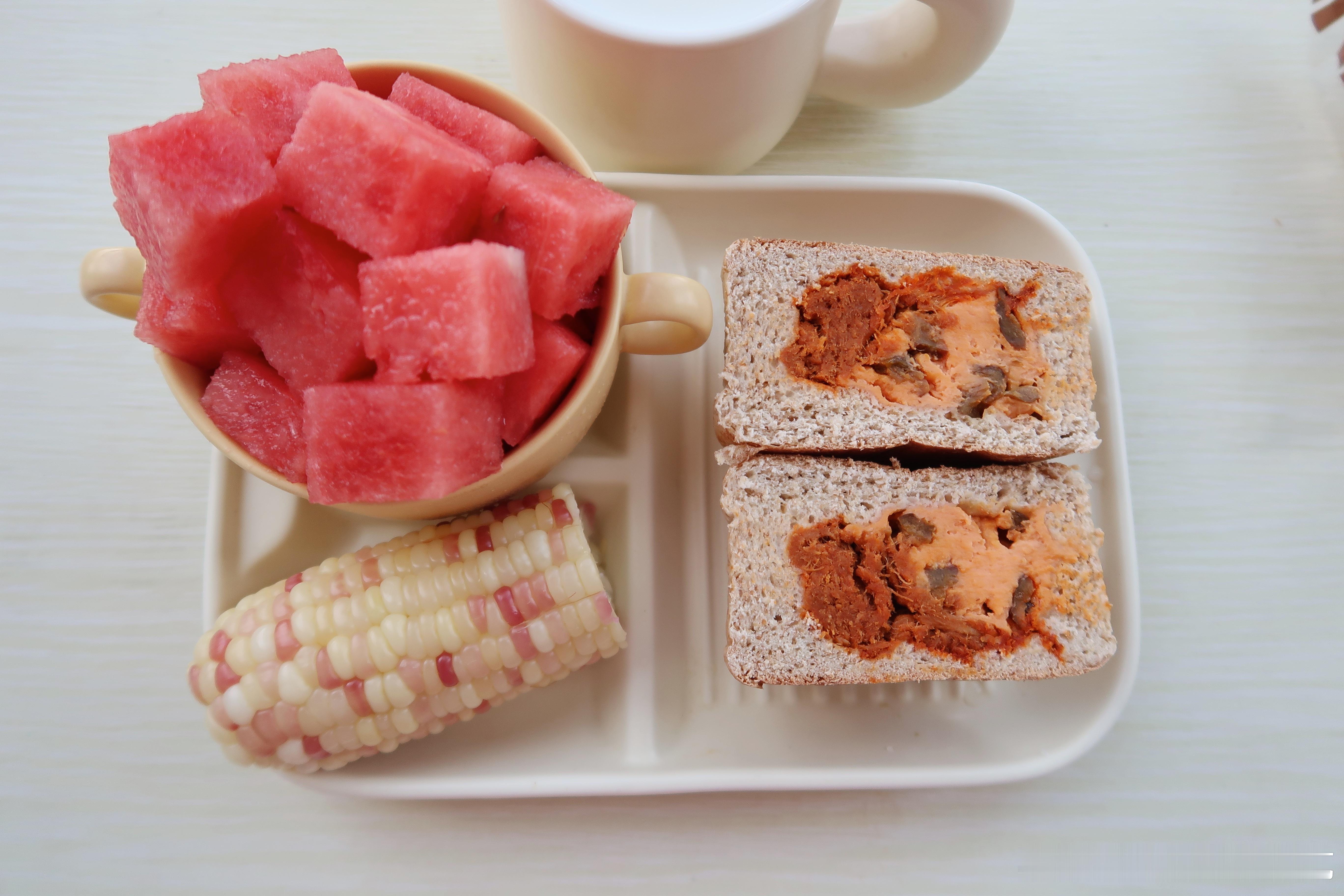 早.今天的早餐是番茄肉松乌梅奶酪面包🥖糯玉米🌽西瓜🍉牛奶🥛