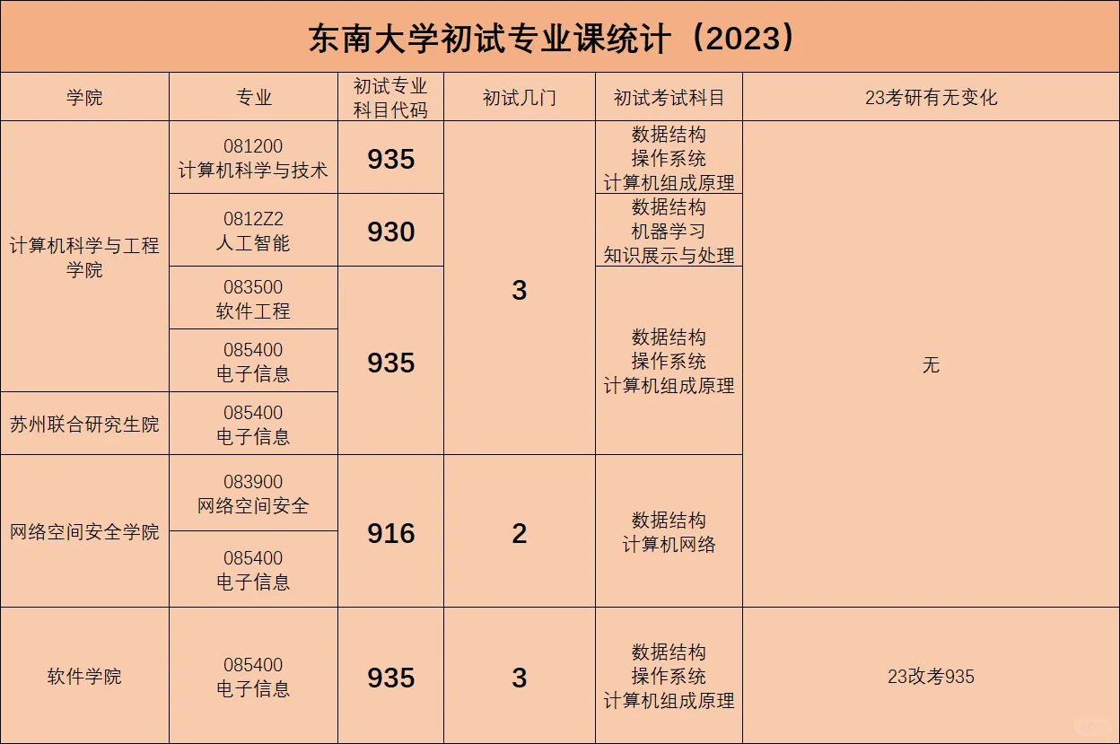 东南大学官宣: 计算机科学与工程学院、苏州联合研究生院、软件学院相关专业中的初试第四单元自命题科目935计算机专业基础变更为全国统考科目408计算机学科专业基础。