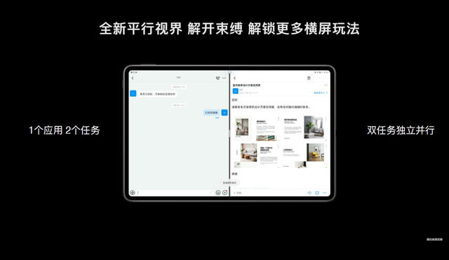 像10英寸以上的大屏设备,由于没有一个完美的横屏生态,不少APP也没有对平板电脑进行适配,在我们横屏使用的时候有很多不便之处。针对这一用户痛点,华为为我们带来了“平行视界”功能,它是华为自主研发的应用分屏功能,可以实现“一个应用,两屏显示”,该功能是在华为平板M6上首次加入。横屏状态下,一个应用,双屏显示,不但让界面更加美观、高效,也让操作更加便捷,拖动屏幕中间的“竖条”还可以自由调整分屏大小。有了“平行视界”功能可以让我们的效率更高,比如在横屏状态下使用微信时,可以一边回复聊天信息,一边浏览朋友圈或者公众号文章,还可同时打开两人的聊天界面,不用反复退出再进入。