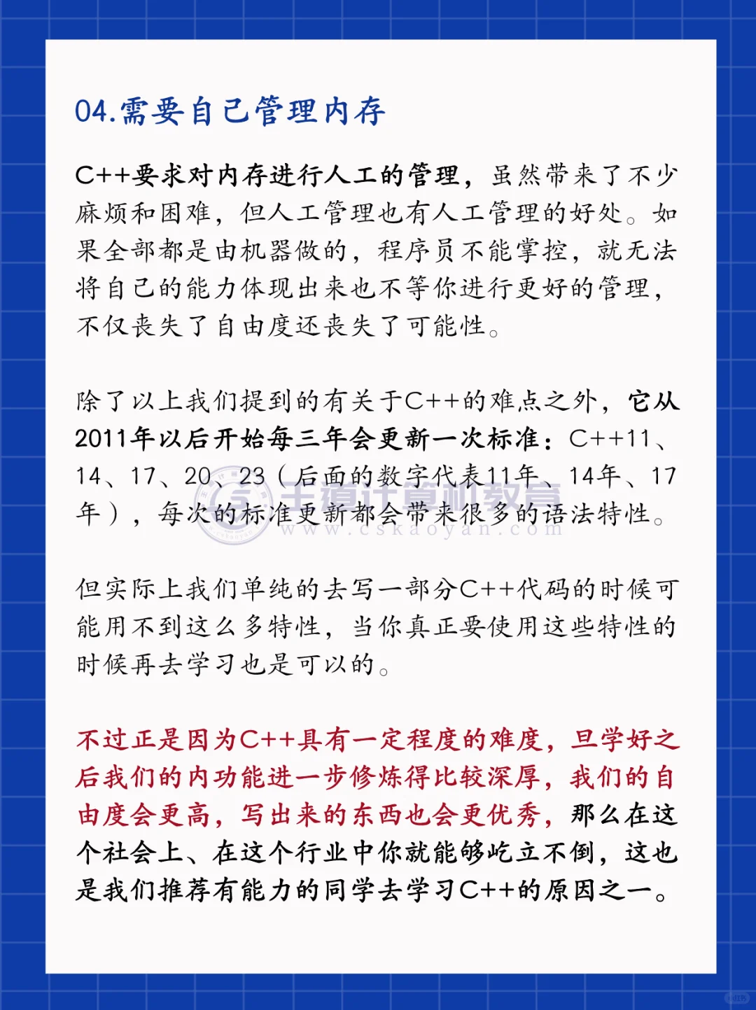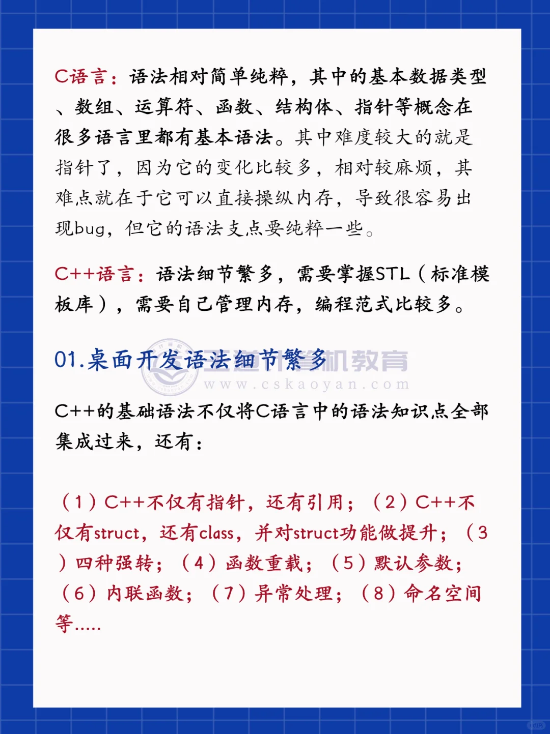C++从设计之初就为兼容c语言做了大量的工作,学习过C的同学,来学习c++会有一些天然的亲切感,很多用法都是可以直接沿用的,在C++代码中嵌入C代码也非常方便。 - 但同时C++提出很多新的语法,弥补了C语言的一些不便之处。 - 比如引用,在一些场景下就可以取代指针; - 比如容器,像set、map,使用起来就比C语言的纯手写实现要方便得多。 - 所以想要更好地学习C++,是可以先学习一下C语言的。