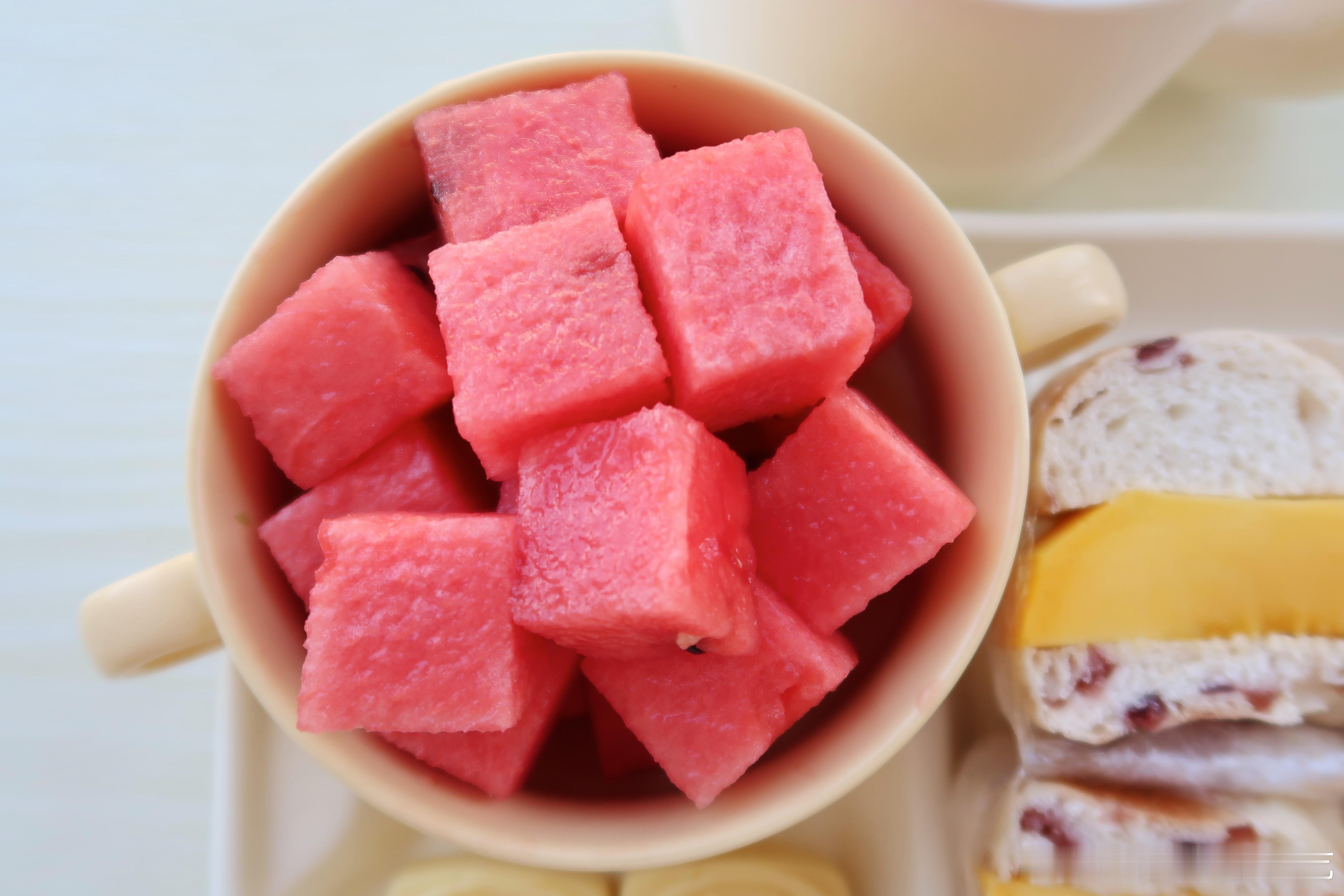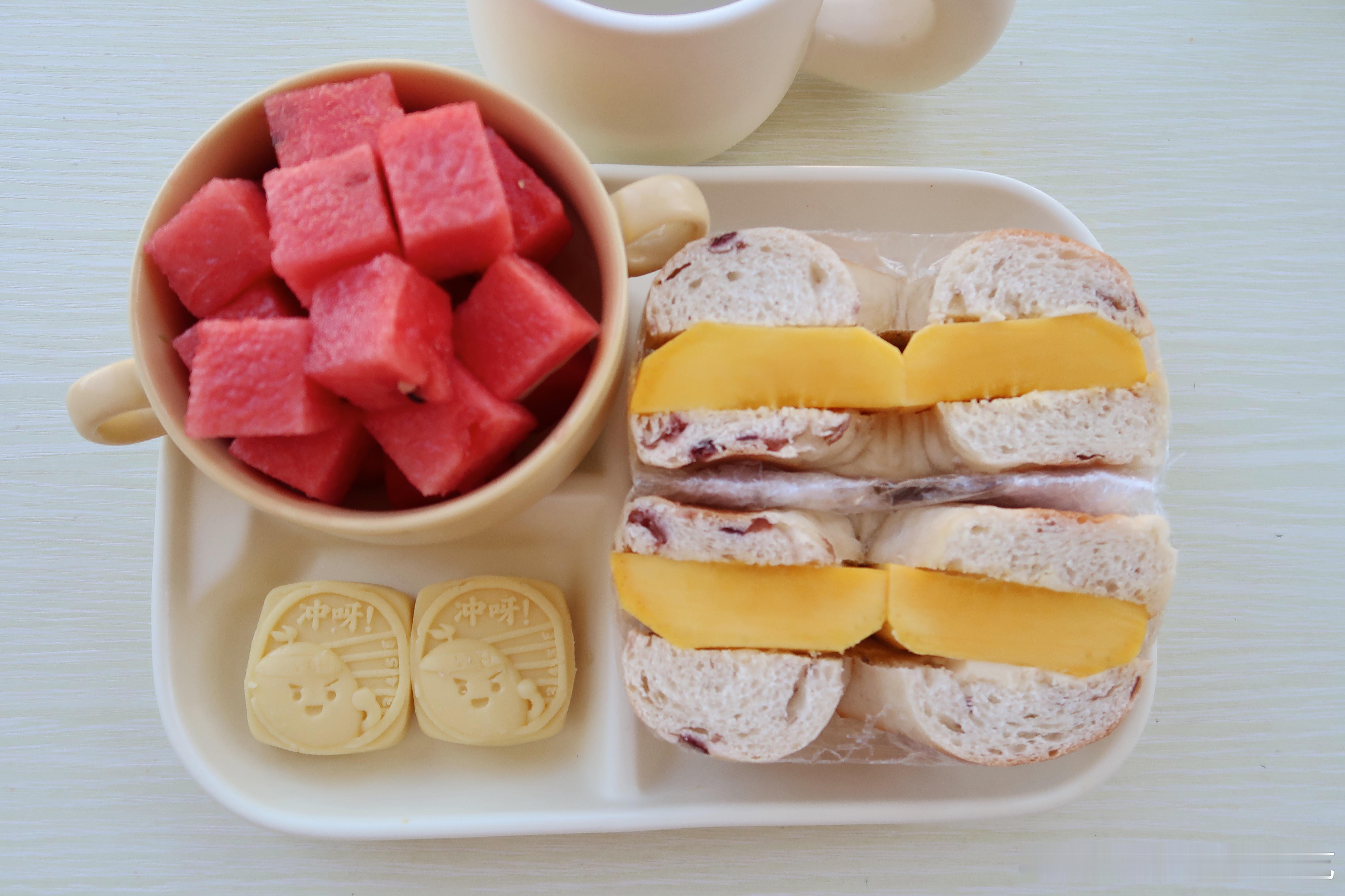周末早餐.今天的早餐是芒果奶酪贝果🥯绿豆糕🫘西瓜🍉椰子水🥥