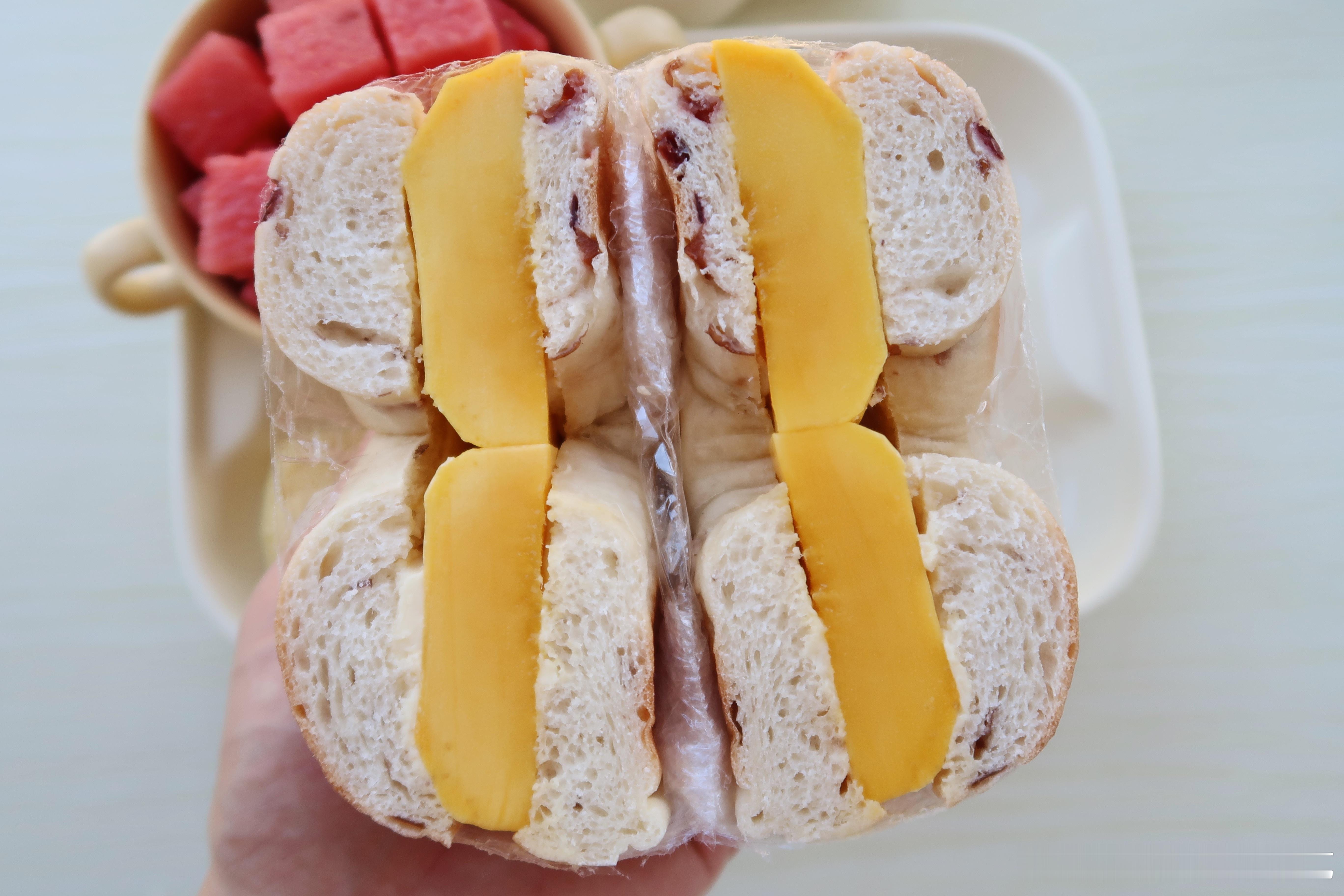 今天的早餐是芒果奶酪贝果,简单好吃.贝果对半切开涂抹奶酪放上大块芒果,每一口吃到芒果的清甜和奶酪的丝滑,很好吃.天气太热啦,每天都要西瓜解暑.#好好吃饭##一秒入夏降温指南#
