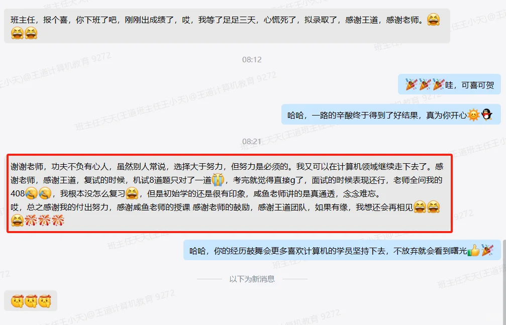 🎉24王道领学班学员,二本双非土木,一战跨考武汉科技大学,从初试的不确定,到复试的忐忑不安,终于收获了好消息,已经被拟录取了,🌟功夫不负有心人,恭喜!” ✨复试面试的都是问的408,答的挺好的,😁咸鱼老师是讲的真透彻,念念不忘,也感谢老师的鼓励,感谢王道团队“感恩感谢,继续加油喔!❤