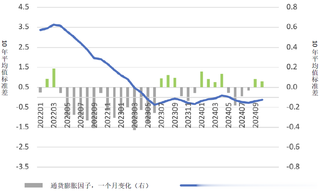 图 2a. 美国:通货膨胀因子,水平和 1 个月变化,2022 年 1 月 - 2024 年 10 月(10 年均值标准差)