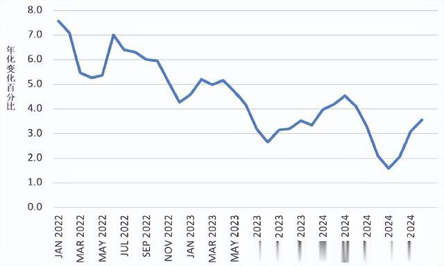 图1a. 美国:核心 CPI 通胀,2022 年 1 月 - 2024 年 10 月(三个月移动平均数的年化变化百分比)