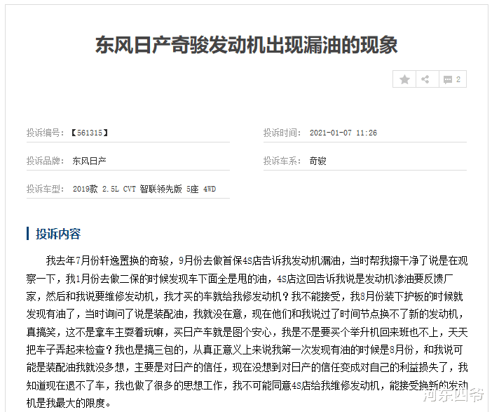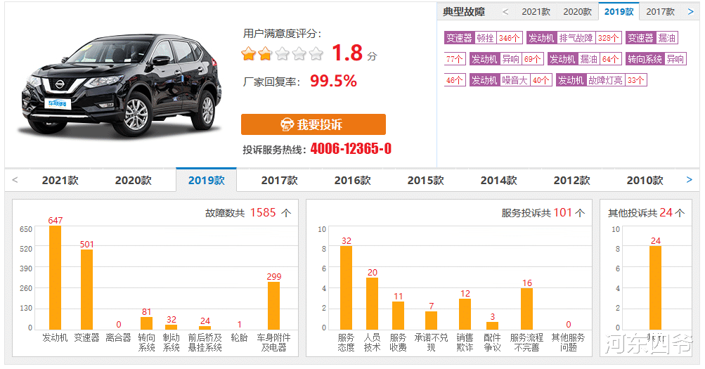 其实,2019款日产奇骏上市后,日产奇骏的投诉也就越来越多,而且我们也特意去车质网查看了一下,被投诉的大部分原因是发动机和变速箱。