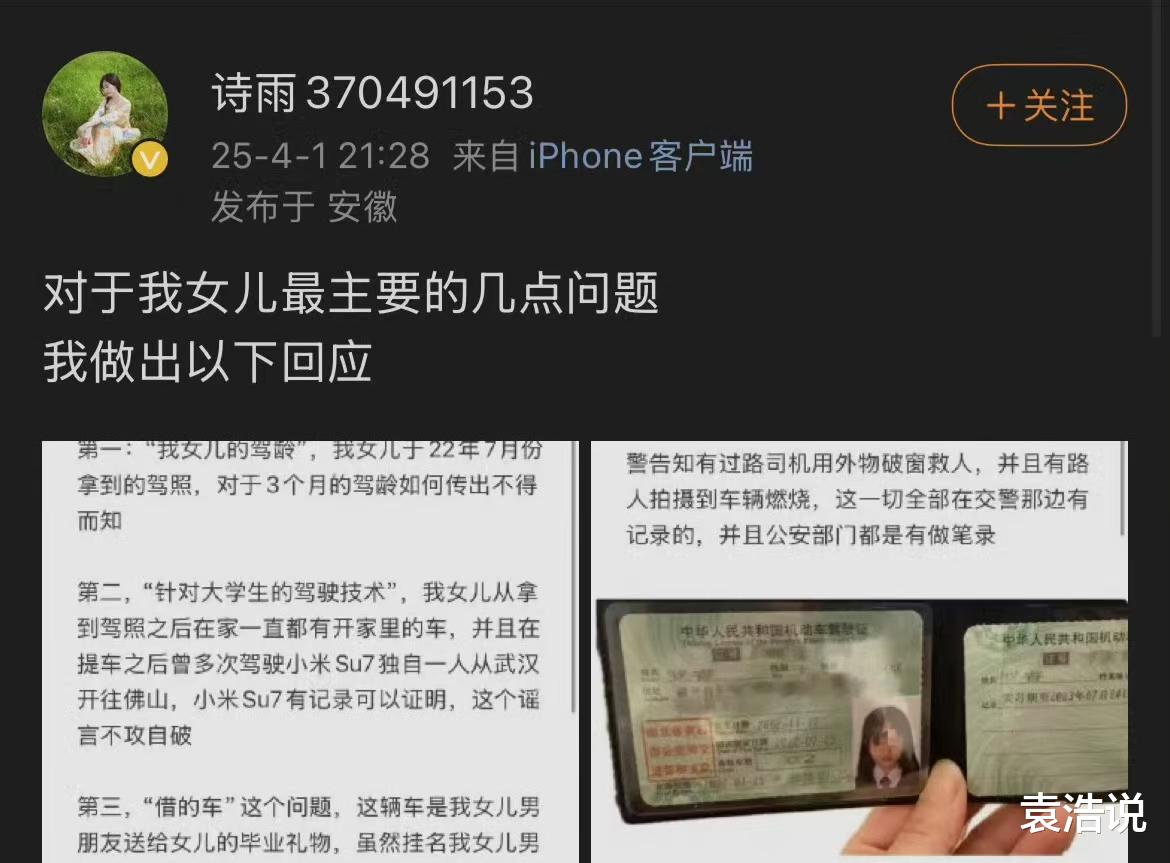 女驾驶员的母亲最初在社交平台上发声,为女儿辩护,称她驾驶经验丰富,还曾驾驶同一辆车跑过长途。