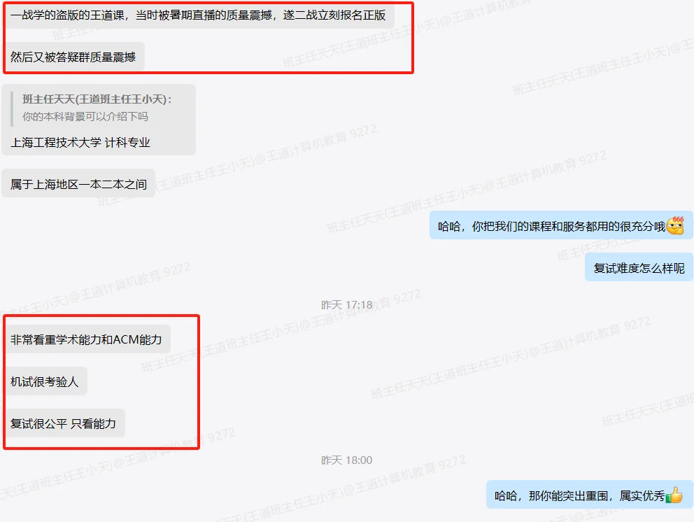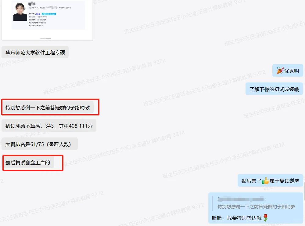 24王道领学班学员,本科上海工程技术大学,二战上岸华东师范大学软件工程专硕,初试343,复试翻盘上岸,” 一战学的王道盗版课,被暑期直播的质量震惊,于是二战立即报名正版,答疑群的质量很好,特别感谢答疑助教子路“ 恭喜同学,能帮助到你,我们也很开心!