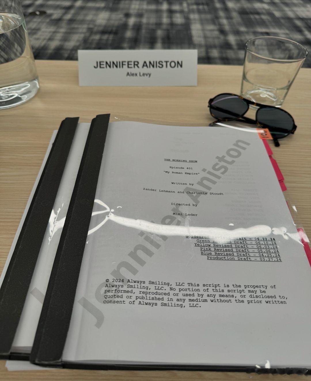 Jennifer Aniston分享《早间新闻》第四季幕后现场图,她跟Reese Witherspoon和Tig Notaro一起参加第四季剧本通读会。