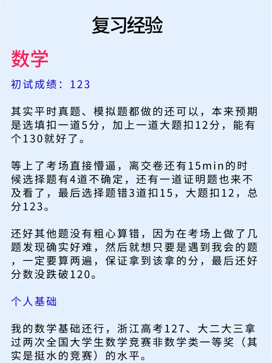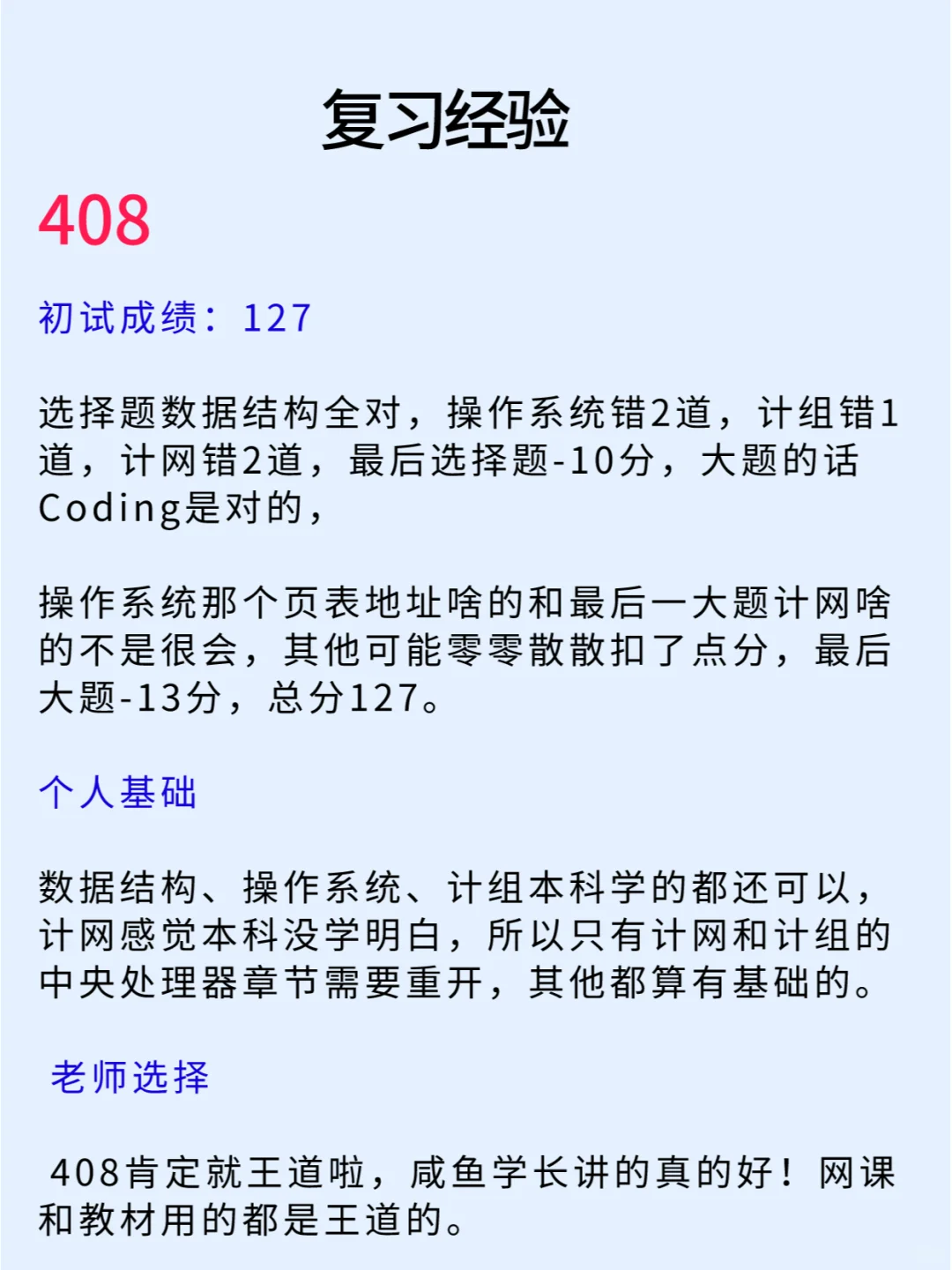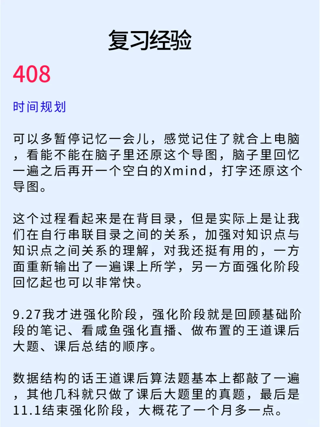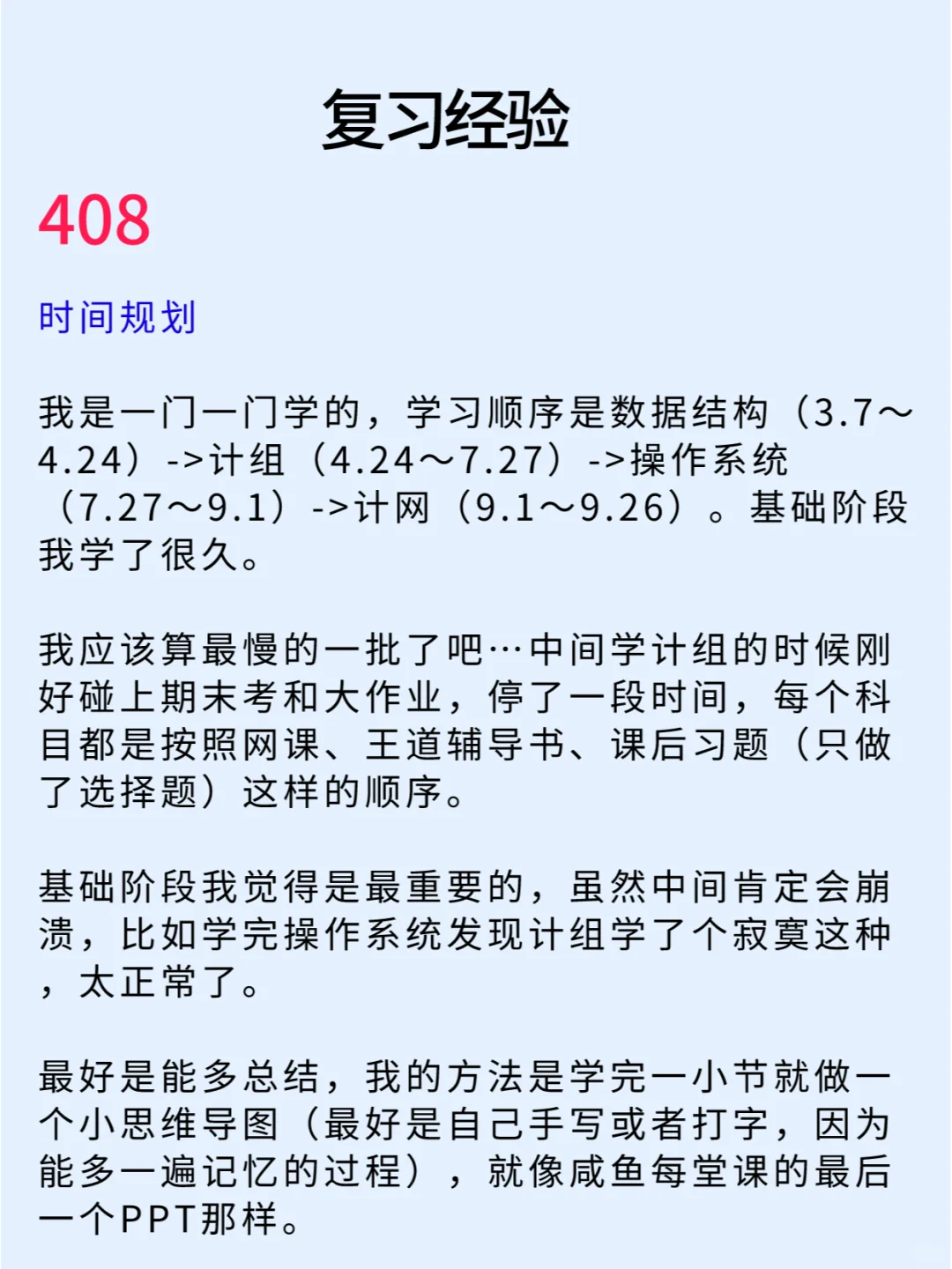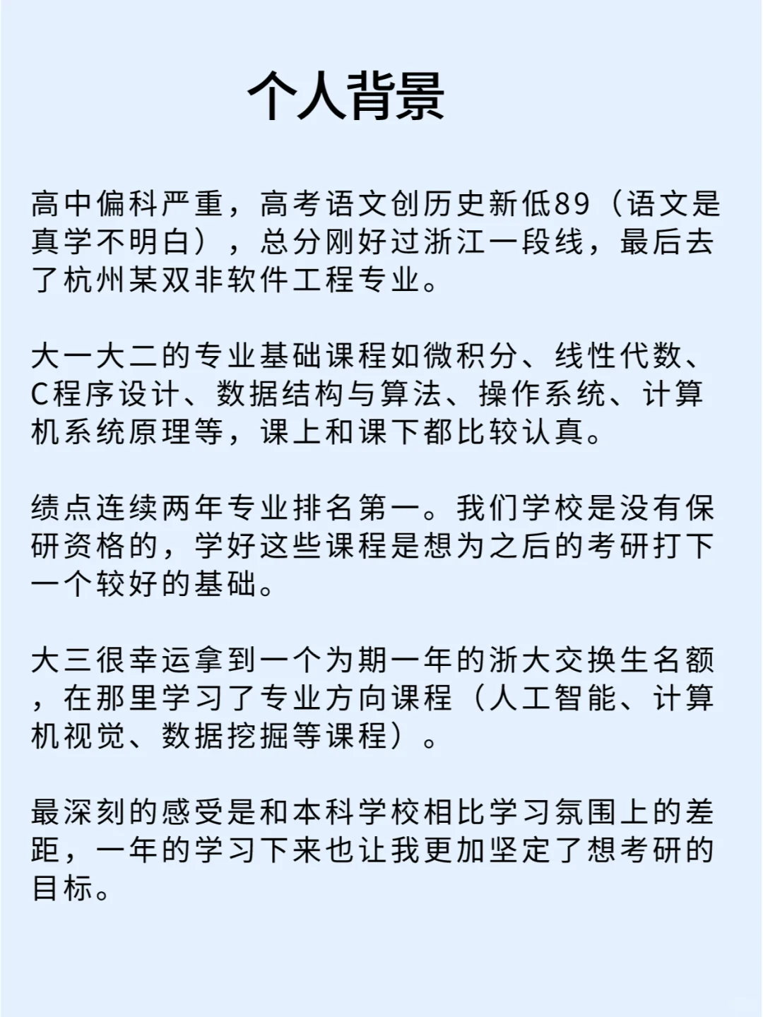 “本科双非,在大三获得了一个为期一年的浙大交换生名额,在那里学习了专业方向课程(人工智能、计算机视觉、数据挖掘等课程)。 - 最深刻的感受是和本科学校相比学习氛围上的差距,一年的学习下来也更加坚定了想考研的目标。” - 本篇笔记详细的分享了专业课408以及数学的复习经验,正在考研不知道如何规划的同学们可以看看 - 学长的经验帖仅供参考,大家还是要根据自己的节奏、进度来喔