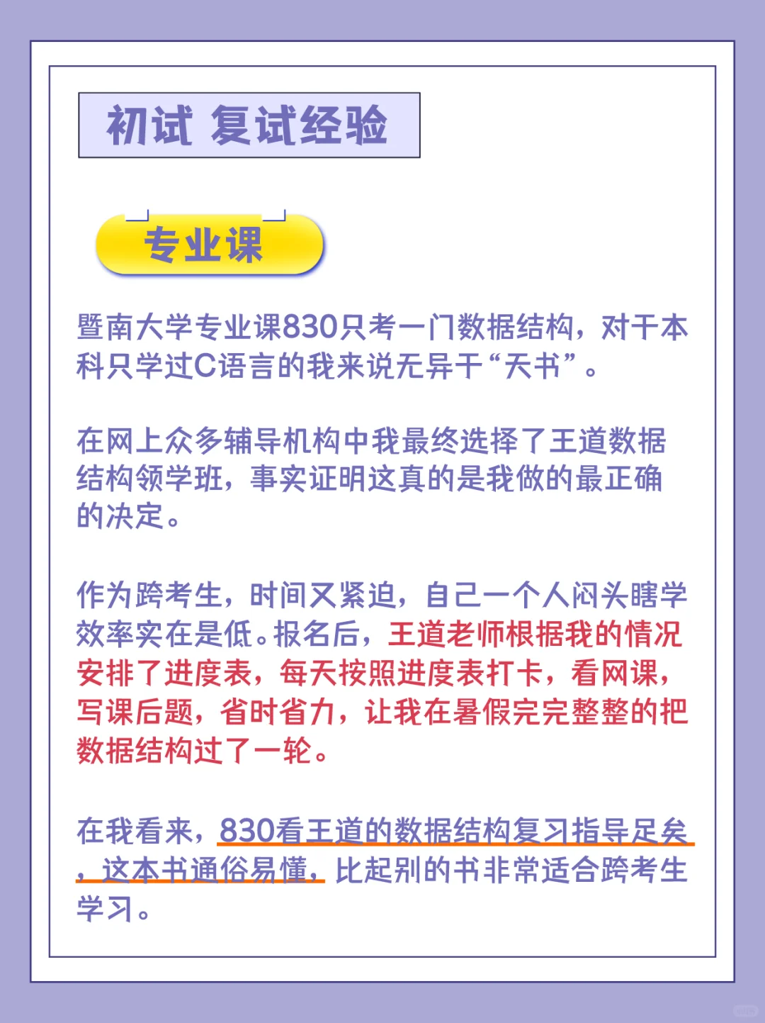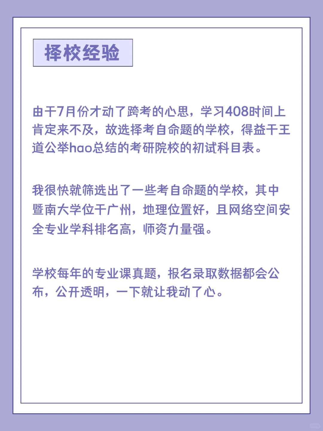 对于想要跨考,准备时间又不太充裕的同学,可以看看这位王道学员的经验分享~ - “本科土木工程,7月开始备考,一战上岸暨南大学网安!” - 干货满满,从择校、初试、到复试的备考心得!