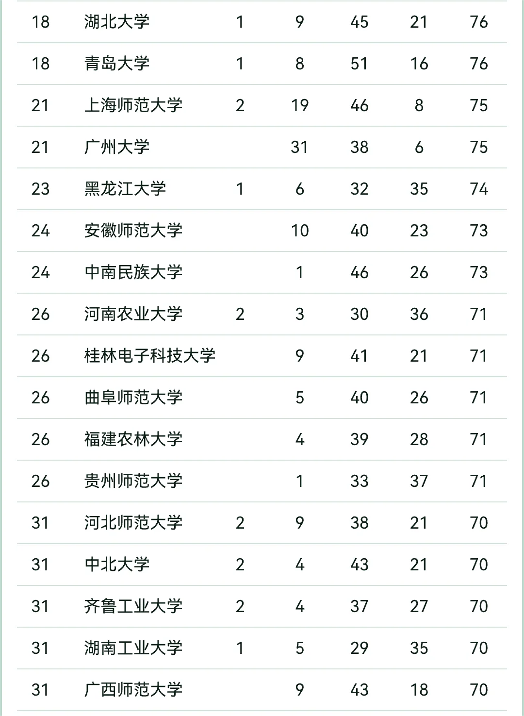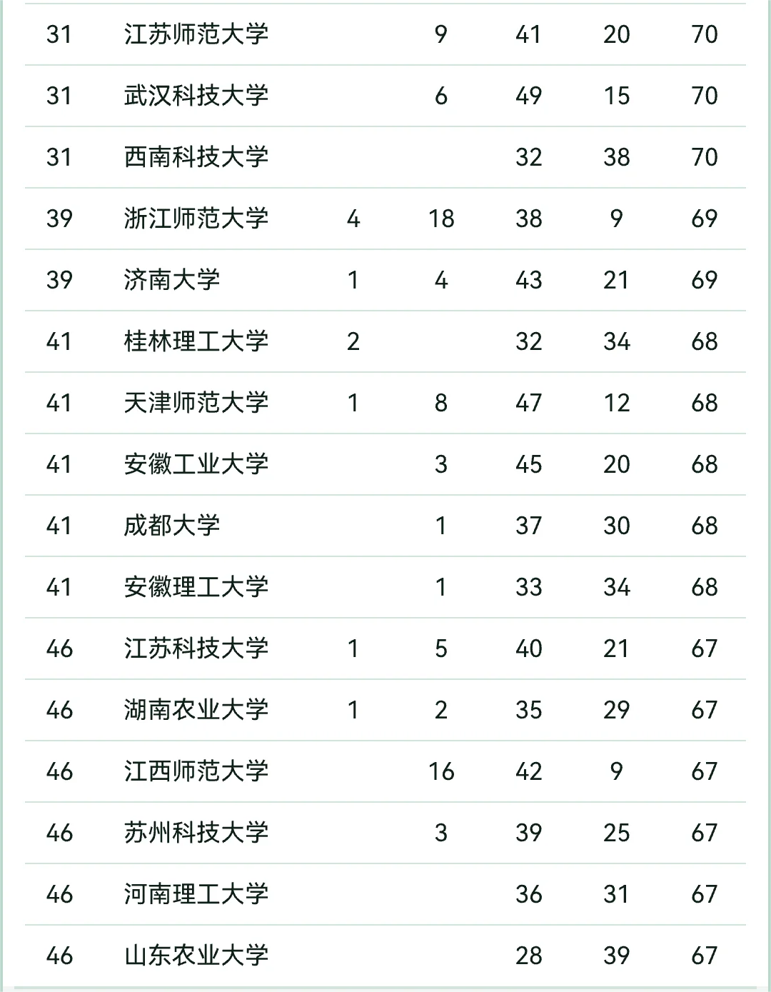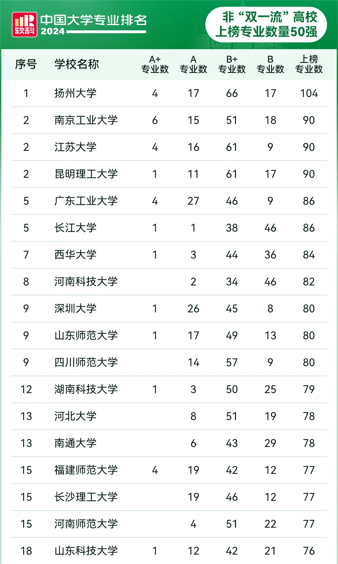 扬州大学一骑绝尘,共104个专业上榜,南京工业大学、江苏大学、昆明理工大学紧随其后。